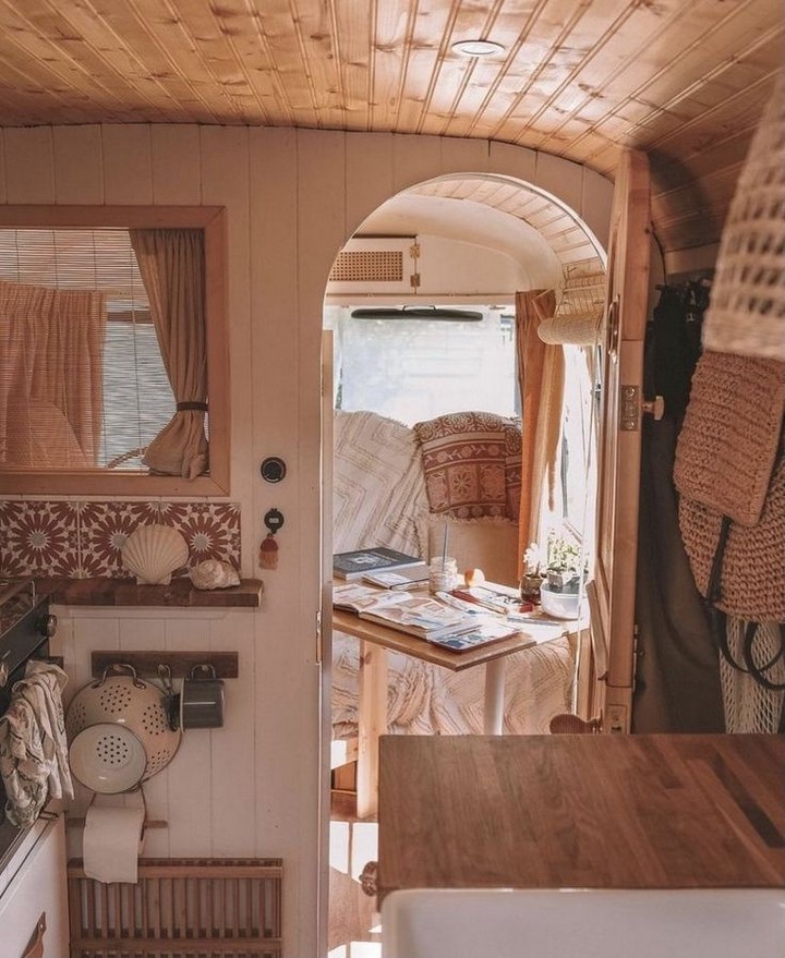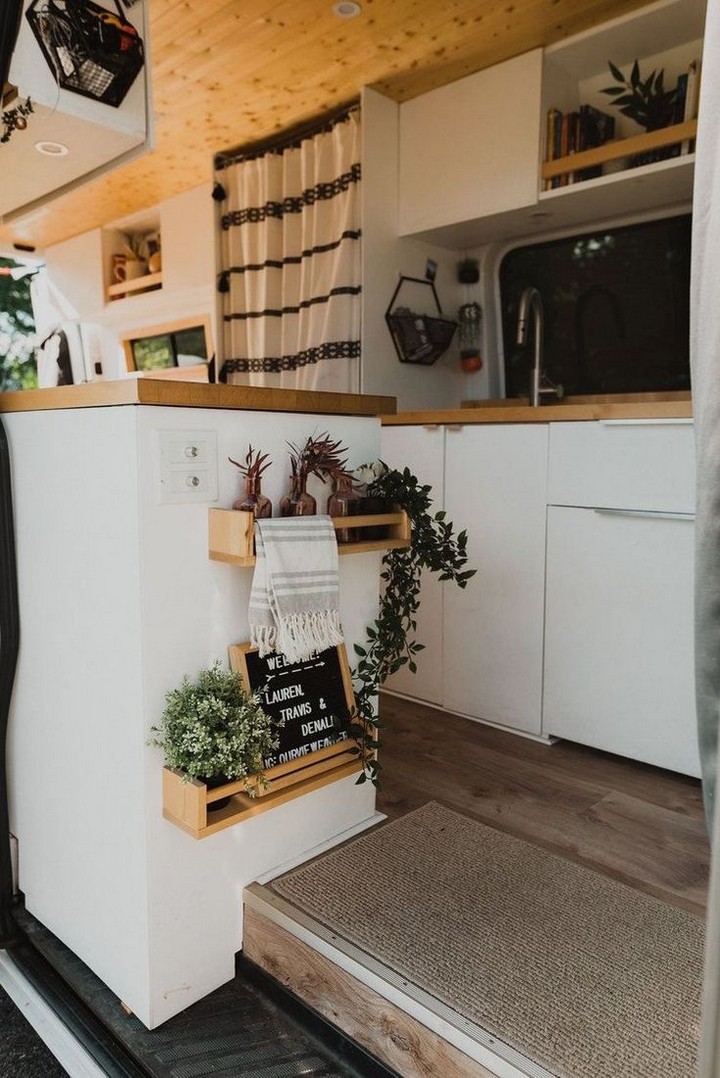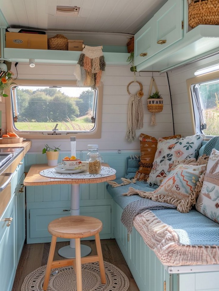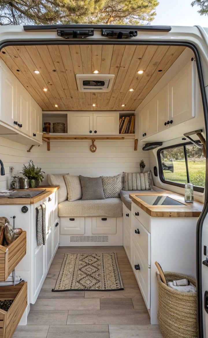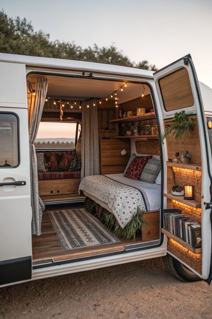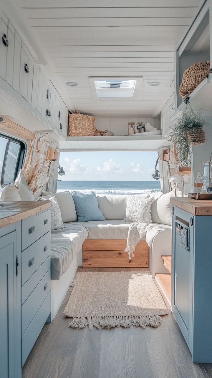 Coastal minimalism captures the essence of beachside living through a pared-down lens. Light, breezy color palettes predominantly feature whites, creams, and soft blues that evoke sky and sea. Natural light is maximized to create the sense of openness associated with shoreline environments. Textiles and accessories incorporate subtle nautical motifs without becoming kitschy think elegant rope details or subdued wave patterns rather than obvious anchors and shells. Materials tend toward those found in beach environments: weathered woods, jute, and canvas. The overall effect is refreshing and open, creating a sense of perpetual vacation regardless of where the van is parked.