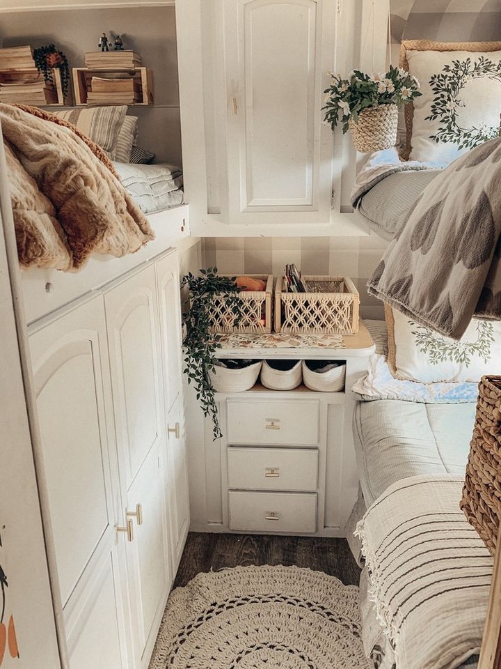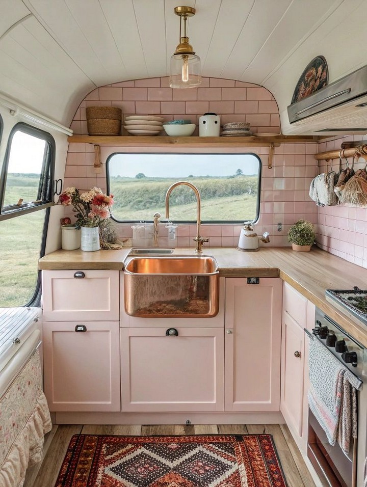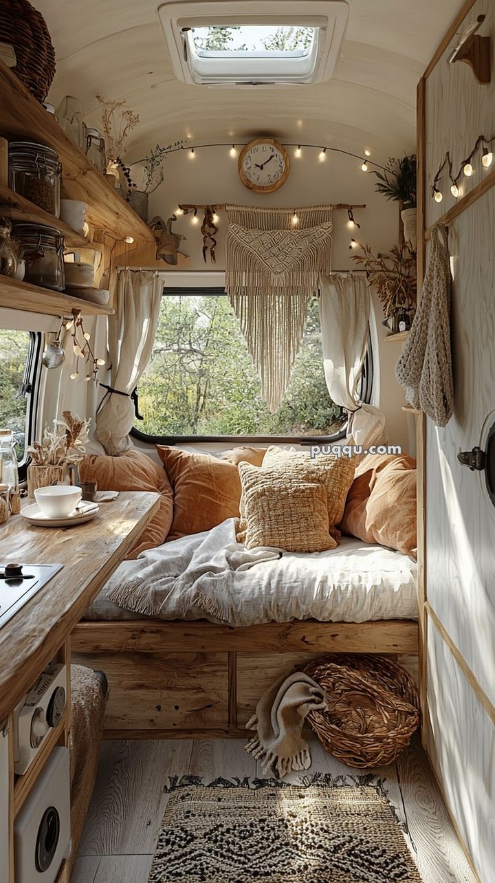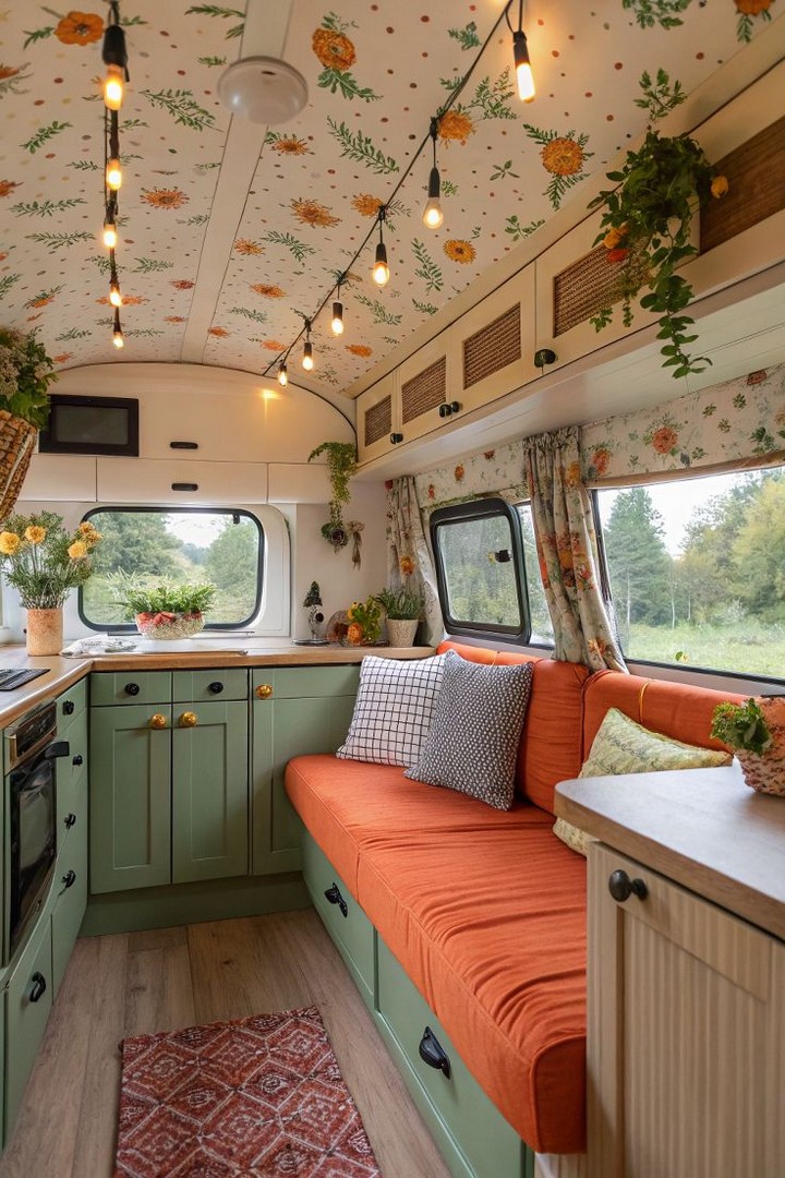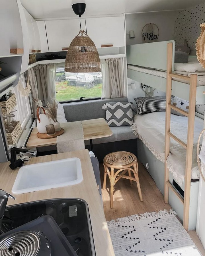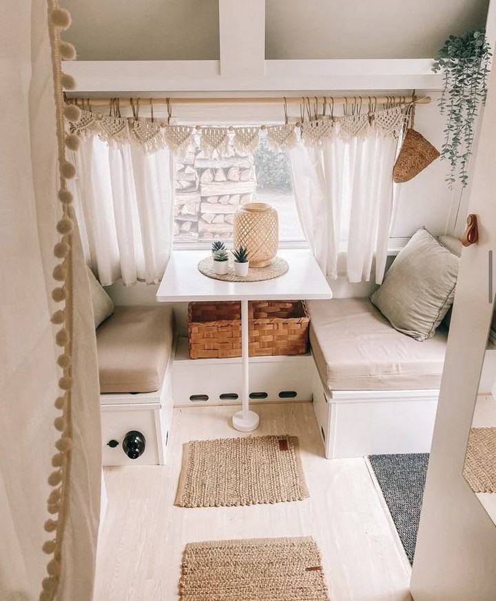 Coastal minimalism captures the essence of beachside living through a pared-down lens. Light, breezy color palettes predominantly feature whites, creams, and soft blues that evoke sky and sea. Natural light is maximized to create the sense of openness associated with shoreline environments. Textiles and accessories incorporate subtle nautical motifs without becoming kitschy think elegant rope details or subdued wave patterns rather than obvious anchors and shells. Materials tend toward those found in beach environments: weathered woods, jute, and canvas. The overall effect is refreshing and open, creating a sense of perpetual vacation regardless of where the van is parked.