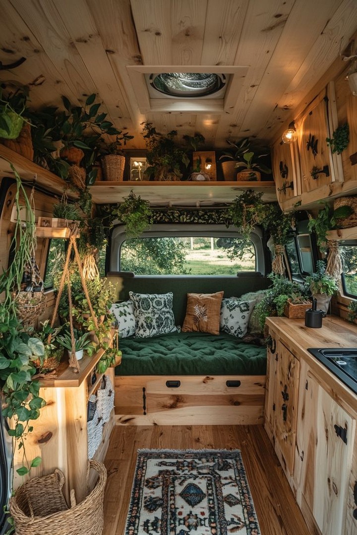 Japanese design principles inspire the Zen aesthetic, creating tranquil, deliberately sparse interiors focused on balance and harmony. Low-profile furniture keeps the space open and uncluttered, while natural materials like bamboo and simple textiles add warmth without visual complexity. Space division comes through elegant solutions like sliding doors or curtains that can be adjusted as needed. The color palette typically features earthy, muted tones that create a grounding atmosphere. Many Zen van conversions incorporate small plant elements to bring nature inside. This aesthetic embraces the concept of “ma” (negative space), allowing room to breathe and creating a meditative atmosphere perfect for long journeys.