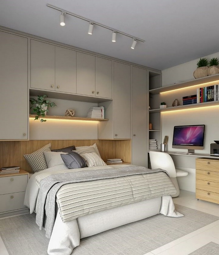 - Overhead Cabinets: Shallow cabinets above the bed can store less frequently used items or display decorative objects.
