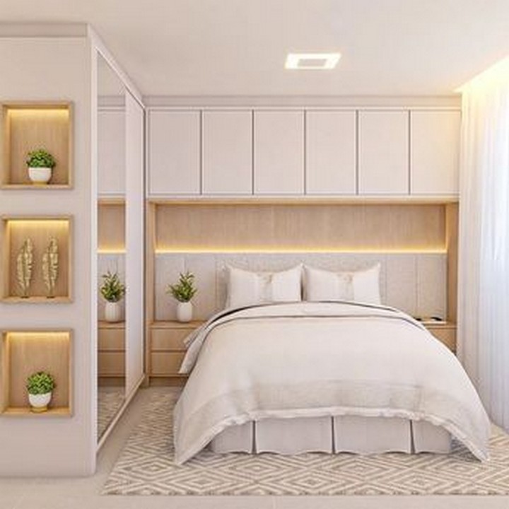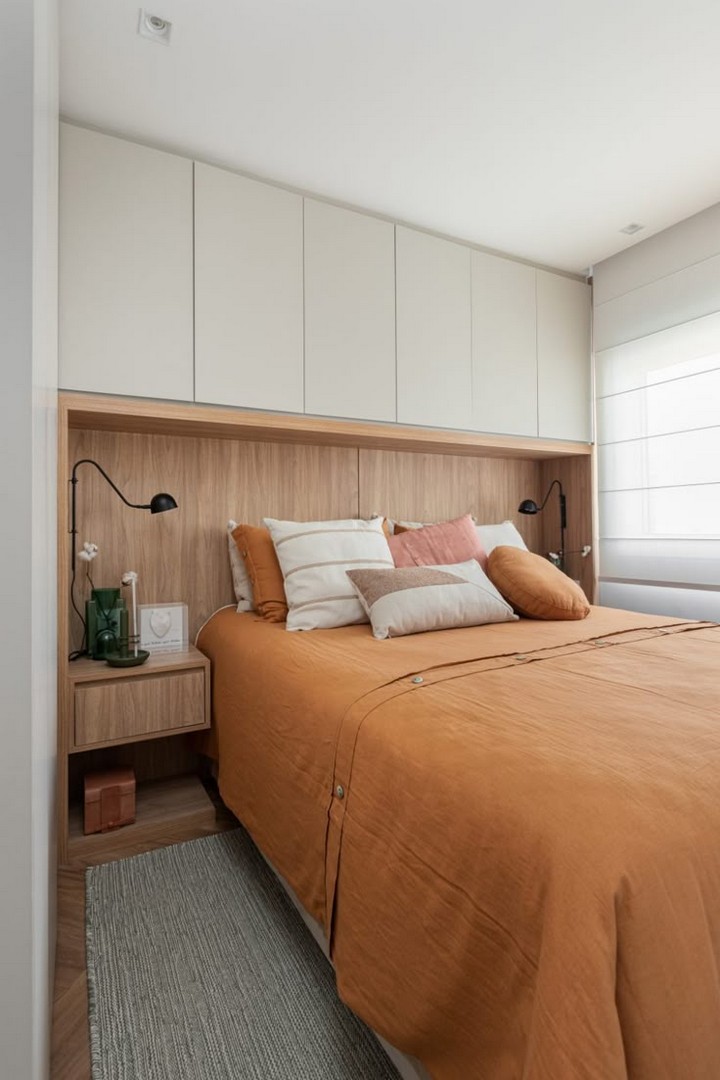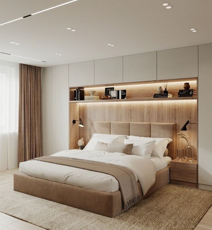 - Niche Lighting: Recessed lighting within headboard cabinetry creates ambiance while reducing the need for lamps.