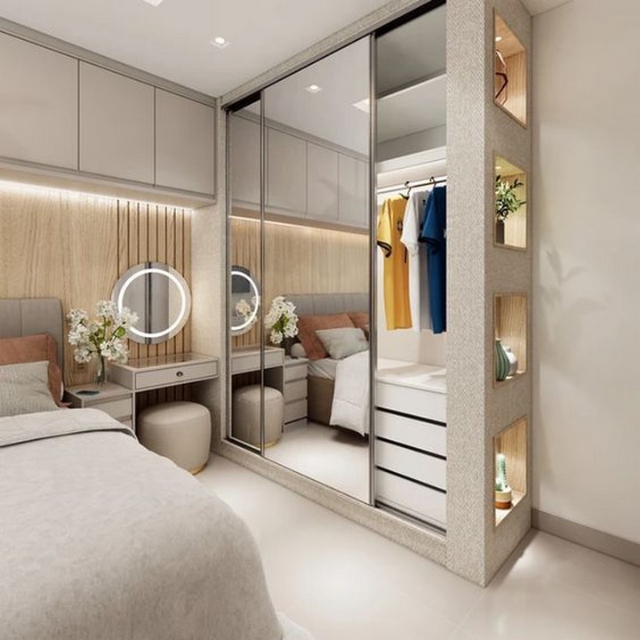 - Mirrored Panels: Strategically placed mirrors on wardrobe doors expand visual space and enhance natural light.