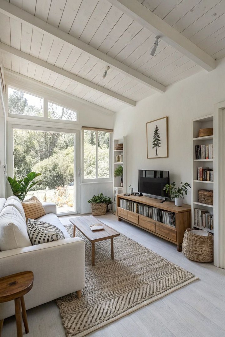 Embrace a monochromatic color scheme in whites, creams, or light grays with low-profile furniture featuring clean lines. Include hidden storage within furniture pieces and use texture (linen, wool, brushed metal) for visual interest without clutter. Quality over quantity is the key principle.