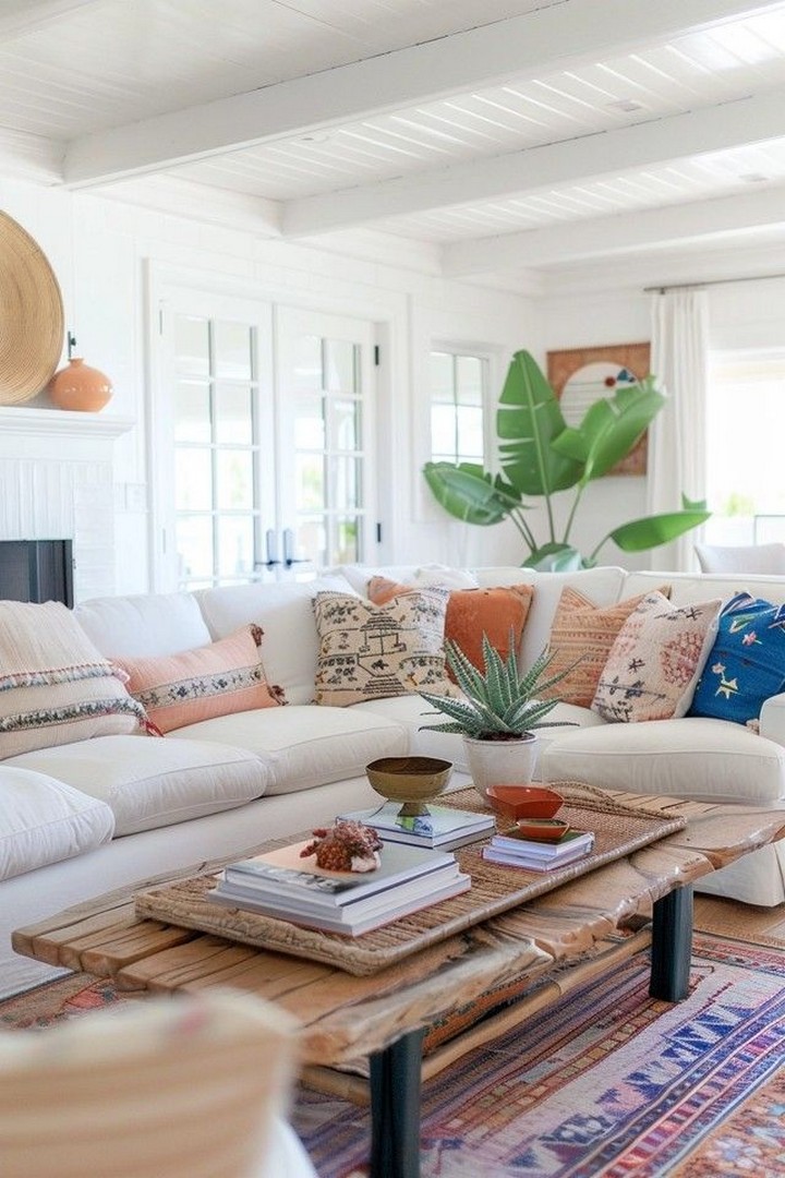 Create visual interest through texture rather than color contrasts. Layer various neutral tones (beige, cream, taupe, greige) in different materials bouclé, linen, leather, wood to add depth without visual chaos. This sophisticated approach maintains flow while adding subtle complexity.
