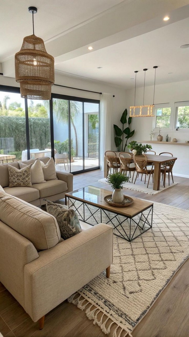 For living rooms with access to balconies or patios, blur boundaries using consistent flooring, sliding glass doors, and complementary color schemes. This visual extension makes the indoor space feel larger by incorporating outdoor areas as part of the usable living environment.