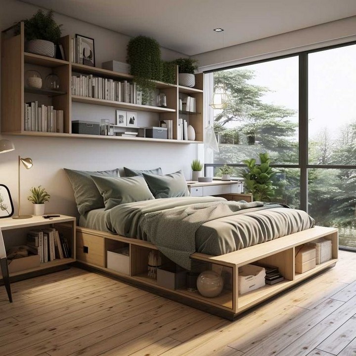 In the bedroom context, floating wooden shelves can hold books, lighting, and a few carefully chosen decorative elements. The key is restraint—these shelves should be thoughtfully arranged with negative space between items rather than packed full.