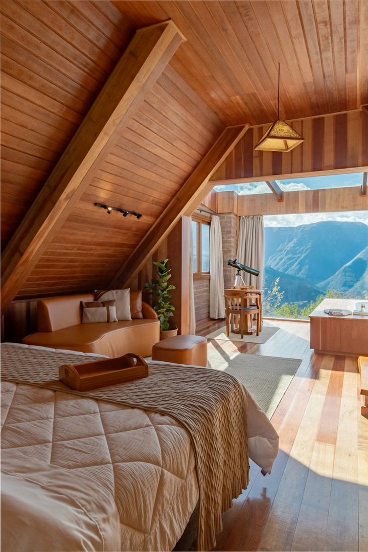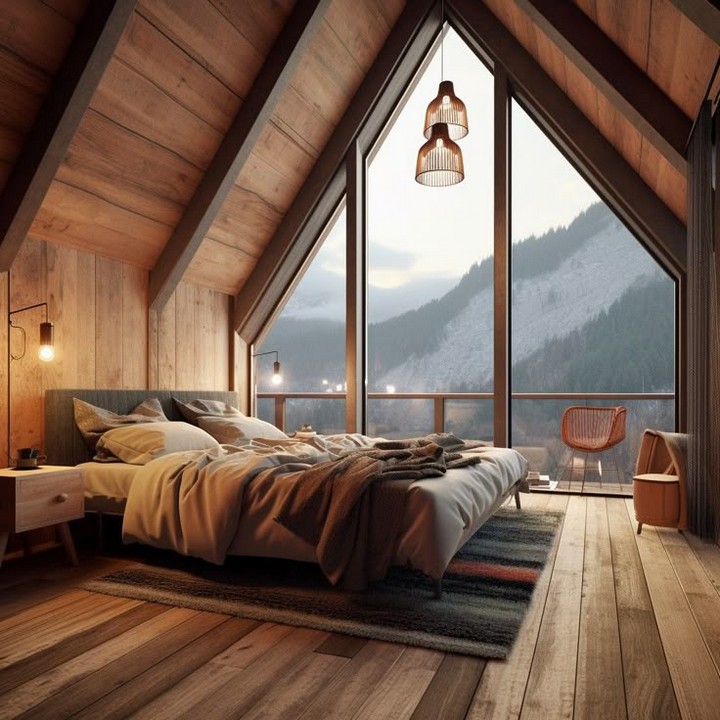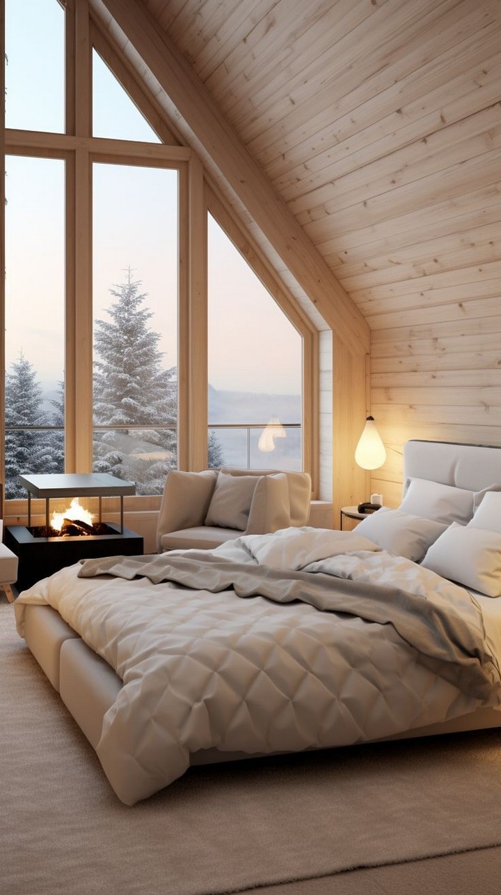 Introduce the stability and permanence of stone into your cabin bedroom design. In traditional Scandinavian cabins, stone elements often appear as fireplaces or hearths, providing essential warmth during cold seasons.