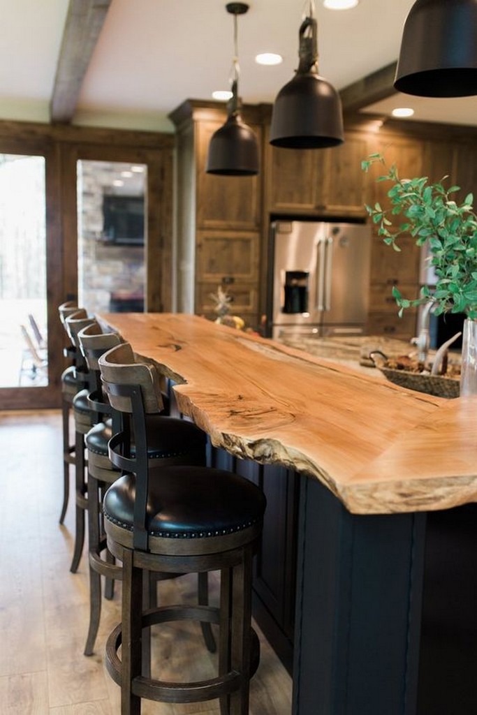 Create a breakfast bar or island with a reclaimed wood countertop. This serves as a focal point and a gathering place for family and friends.