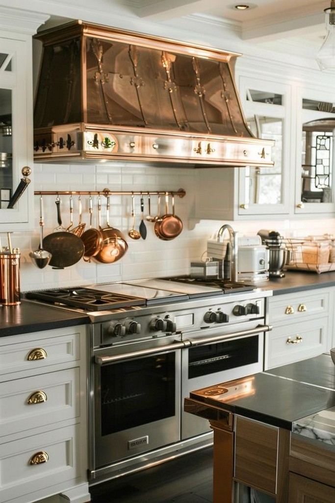 Introduce copper accents, such as cookware or fixtures, to add warmth and a touch of elegance to the kitchen.