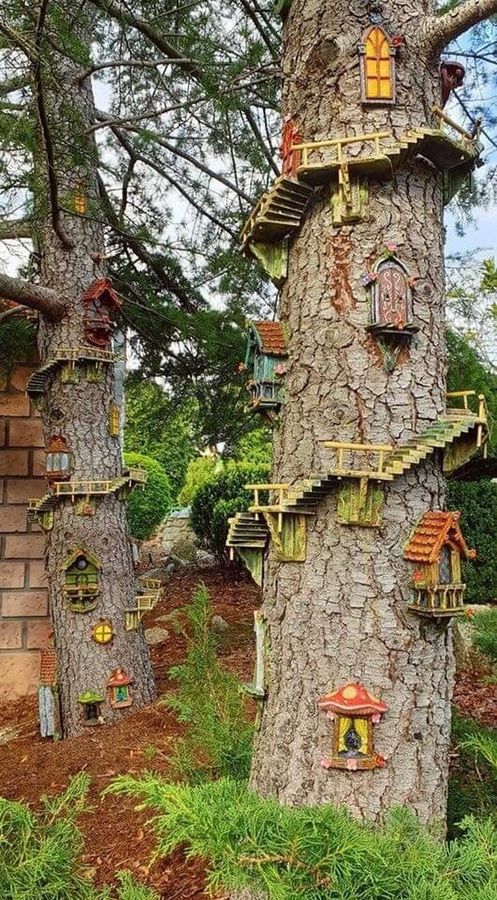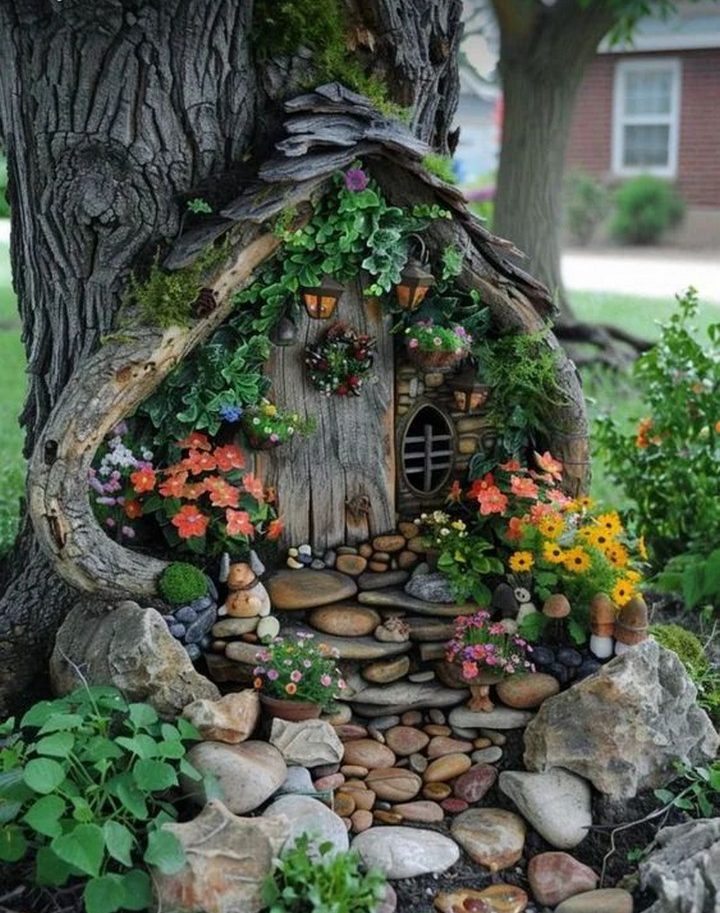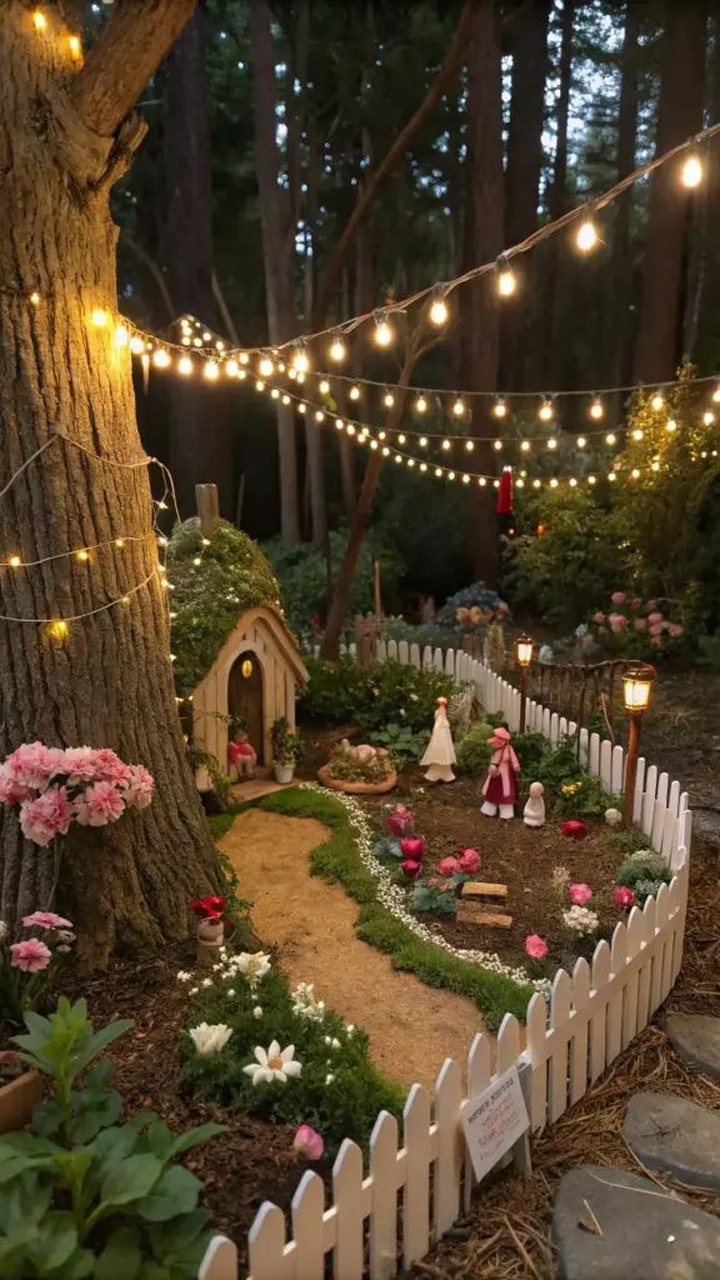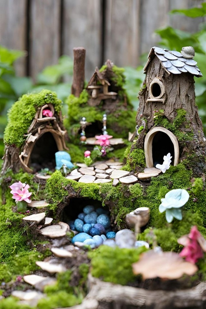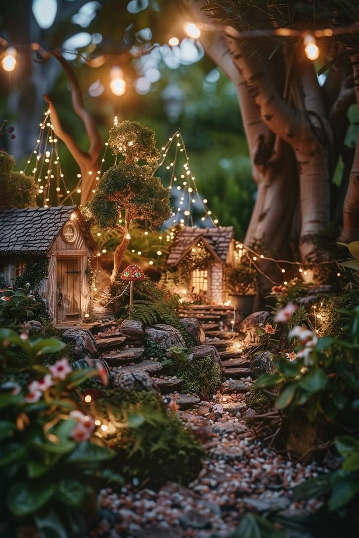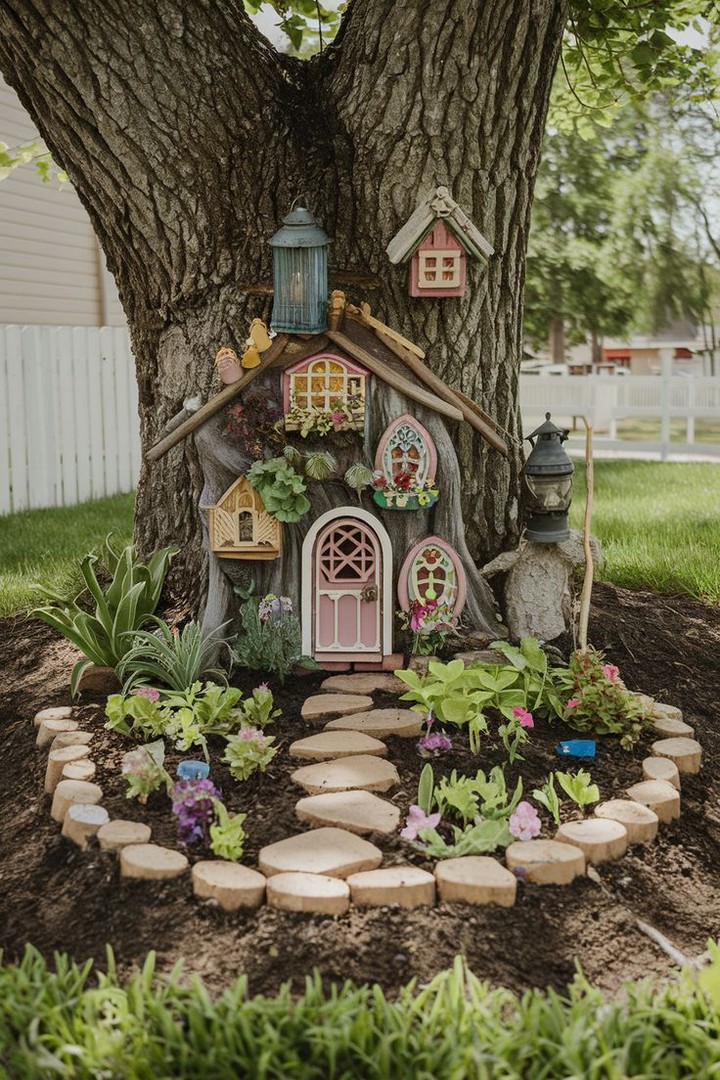 Repurpose an old tree stump into a multi-level fairy village. Use small doors, windows, and ladders to create a cozy dwelling. Enhance it with fairy lights for a magical nighttime glow.