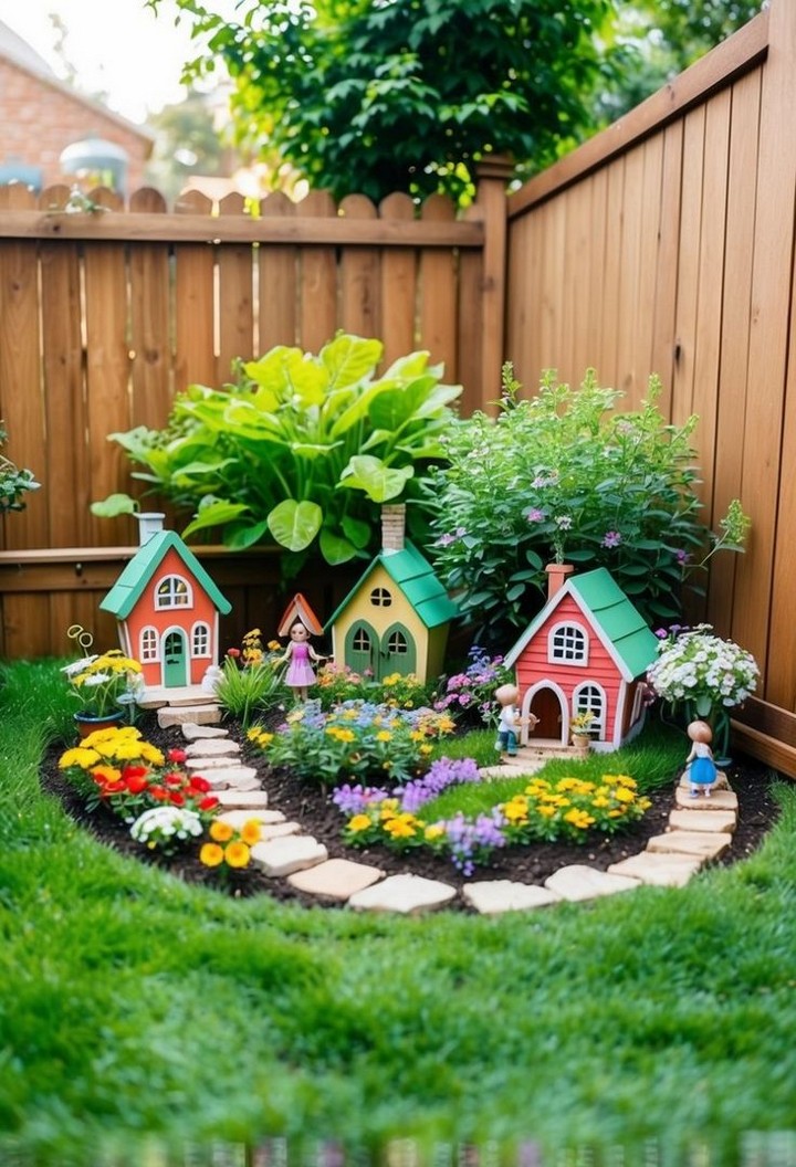 Create a kid-friendly fairy garden with colorful decorations, plastic fairy figures, and interactive elements like a small sandbox or a mini swing.