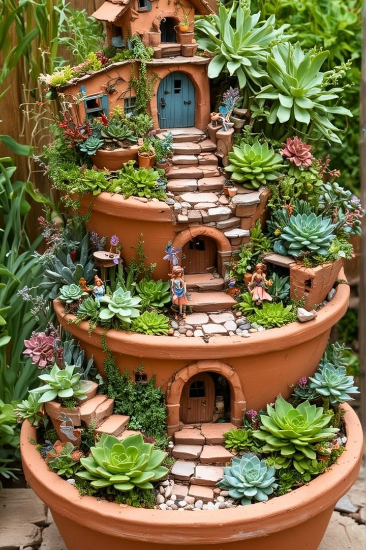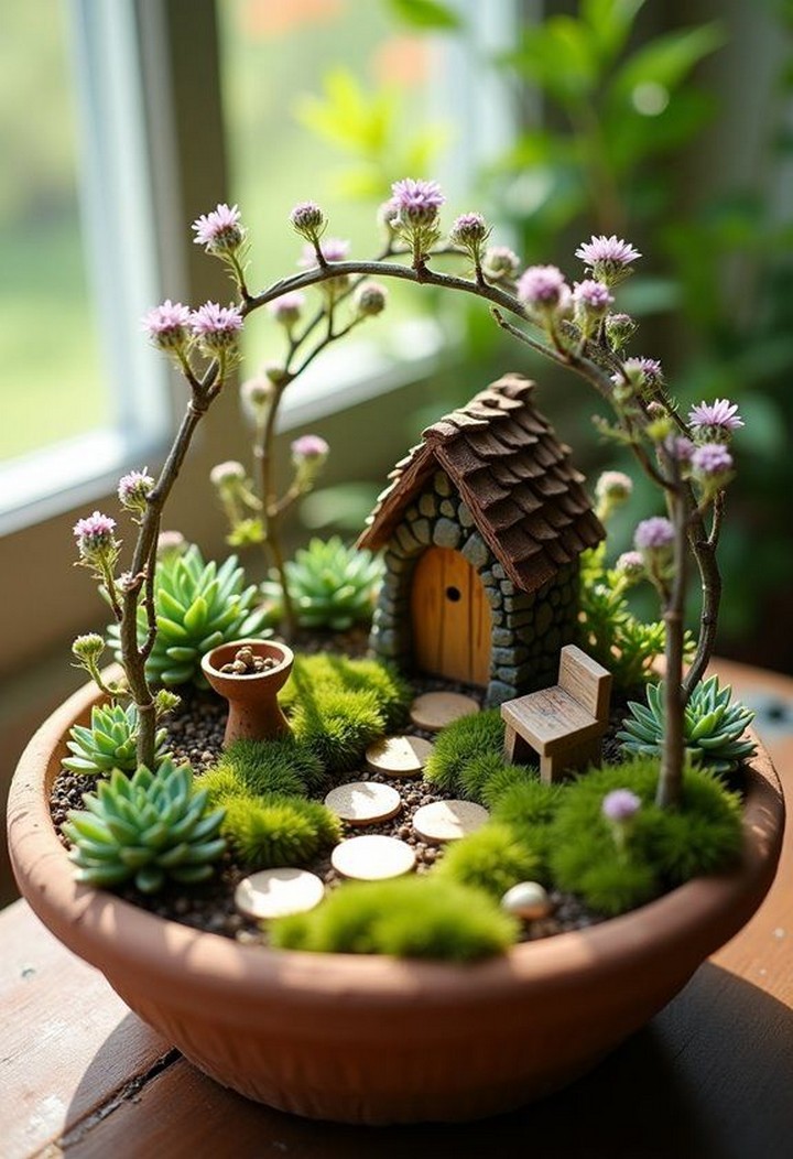 Combine the low-maintenance beauty of succulents with fairy garden elements. Use a shallow dish and arrange different types of succulents with miniature fairy accessories like tiny chairs and fountains.