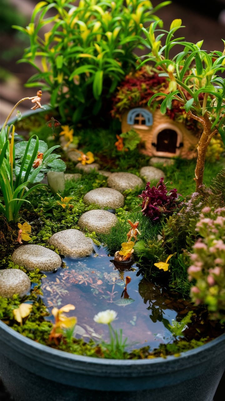 Incorporate a small mirror or a shallow dish filled with water to mimic a pond. Surround it with stones, plants, and tiny frogs or ducks for added charm.