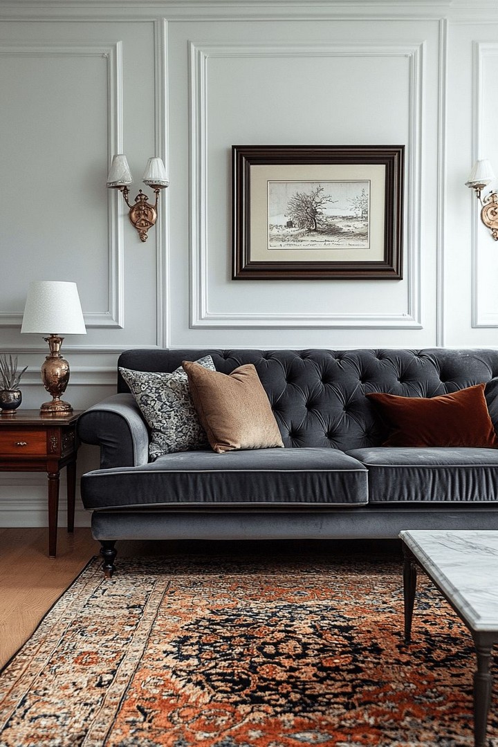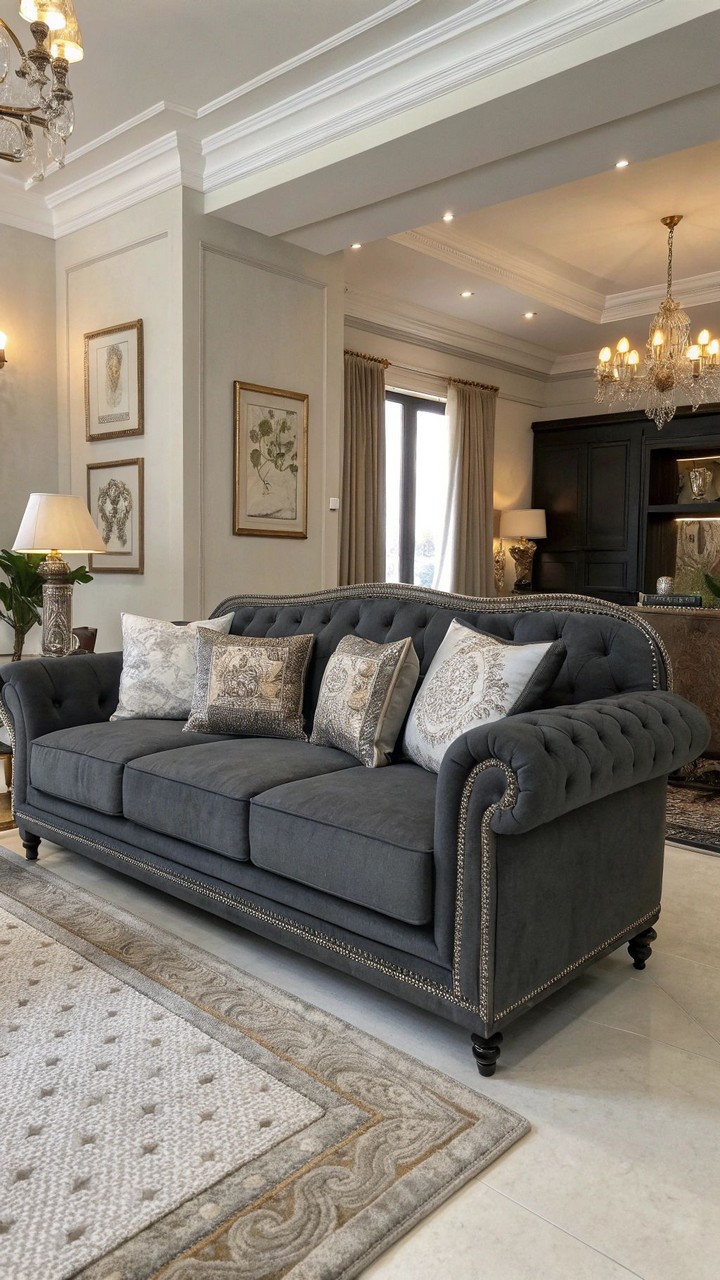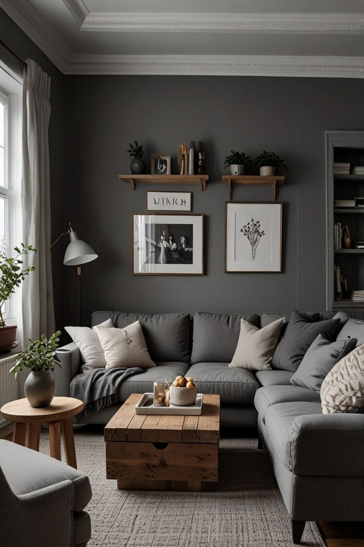 Transform one wall into a focal point using deep charcoal or slate grey paint. Position your sofa against this wall and add lighter grey accessories to create a stunning contrast that draws the eye without overwhelming the space.