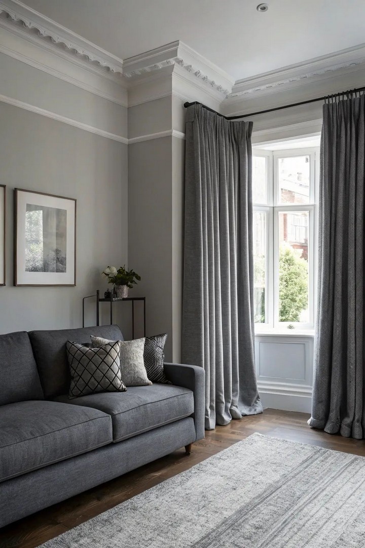 Combine grey curtain panels with white sheers or roman shades for a layered look that provides privacy while allowing natural light to filter through beautifully.