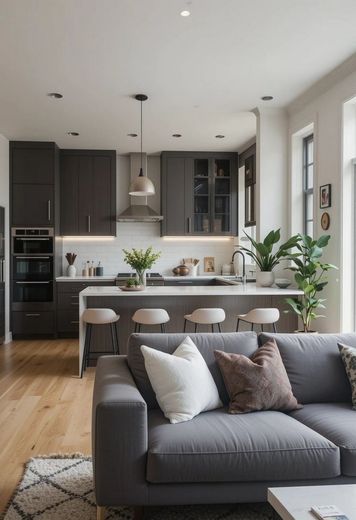 If your living room opens to the kitchen, consider a grey kitchen island that creates visual continuity between spaces while defining separate areas.
