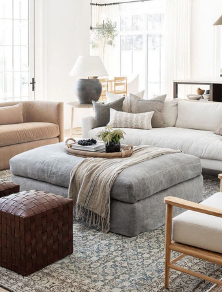 Add functionality and style with a large tufted grey ottoman that serves as extra seating, a coffee table, or footrest. Choose one with hidden storage for added practicality.