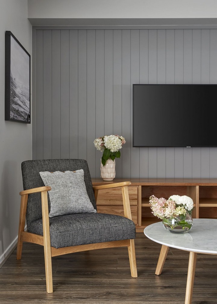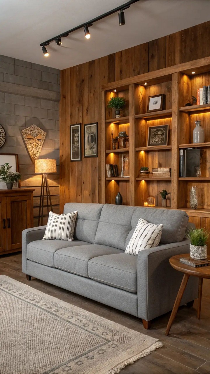 Install grey-painted shiplap or wood paneling on one wall to add architectural interest and texture. This treatment works particularly well behind a sofa or entertainment center.