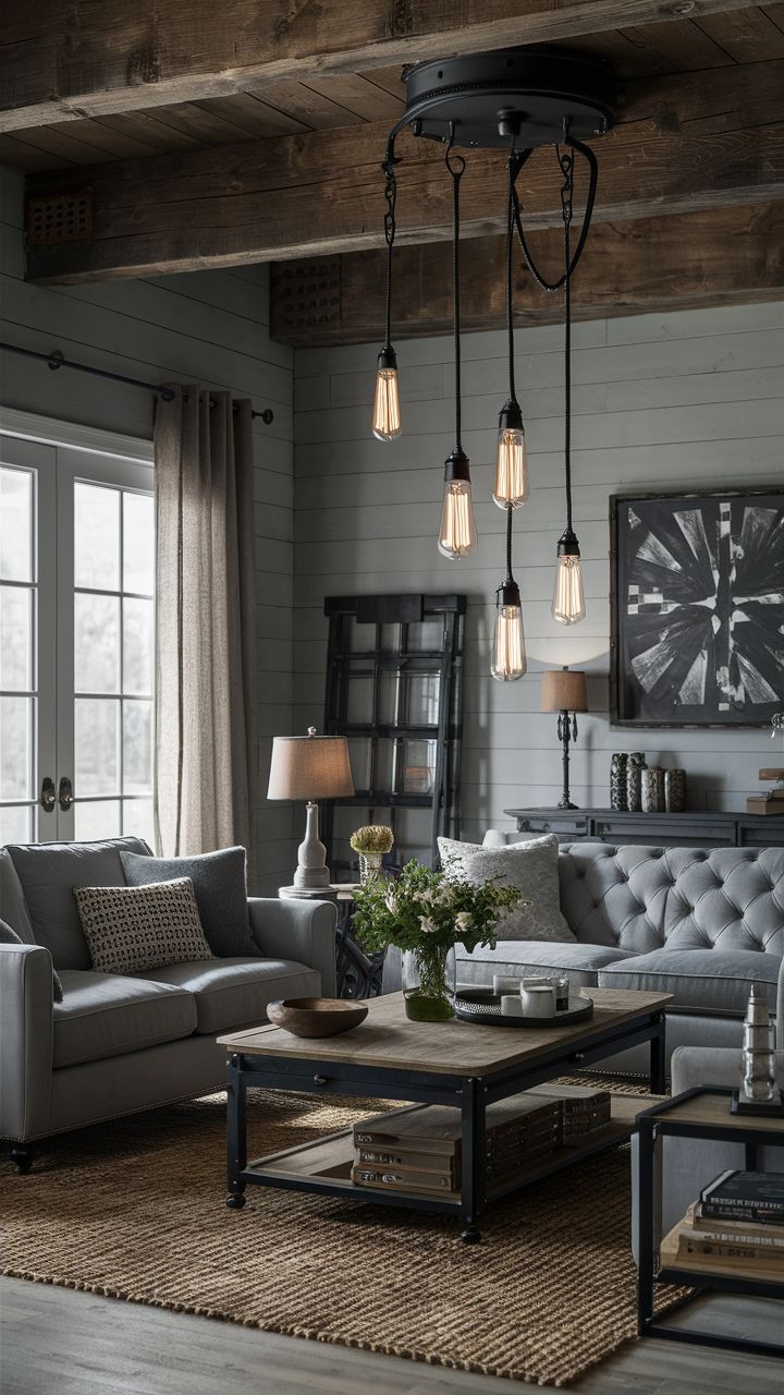 Balance cool grey tones with warm natural wood elements through coffee tables, side tables, or exposed ceiling beams to create a welcoming, organic feel.