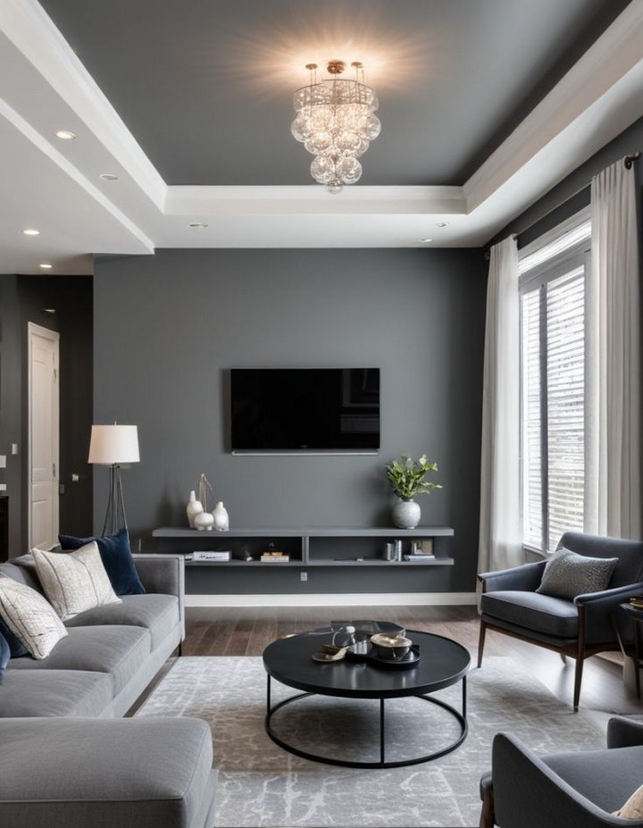 Paint the ceiling in a soft grey shade slightly darker than the walls to create intimacy and coziness. This technique works particularly well in rooms with high ceilings.