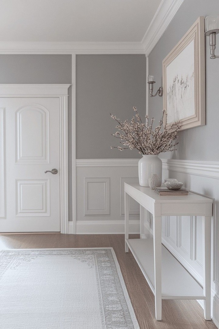 Paint walls in a warm grey shade like “Agreeable Gray” or “Classic Gray” and pair with crisp white trim and molding. This combination creates architectural interest while keeping the space feeling open and airy.