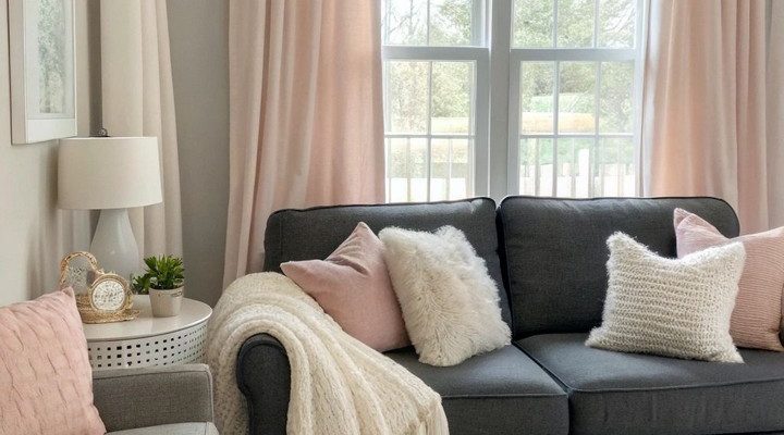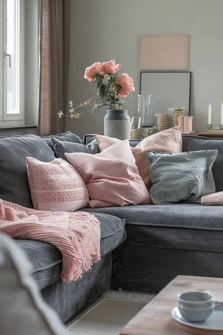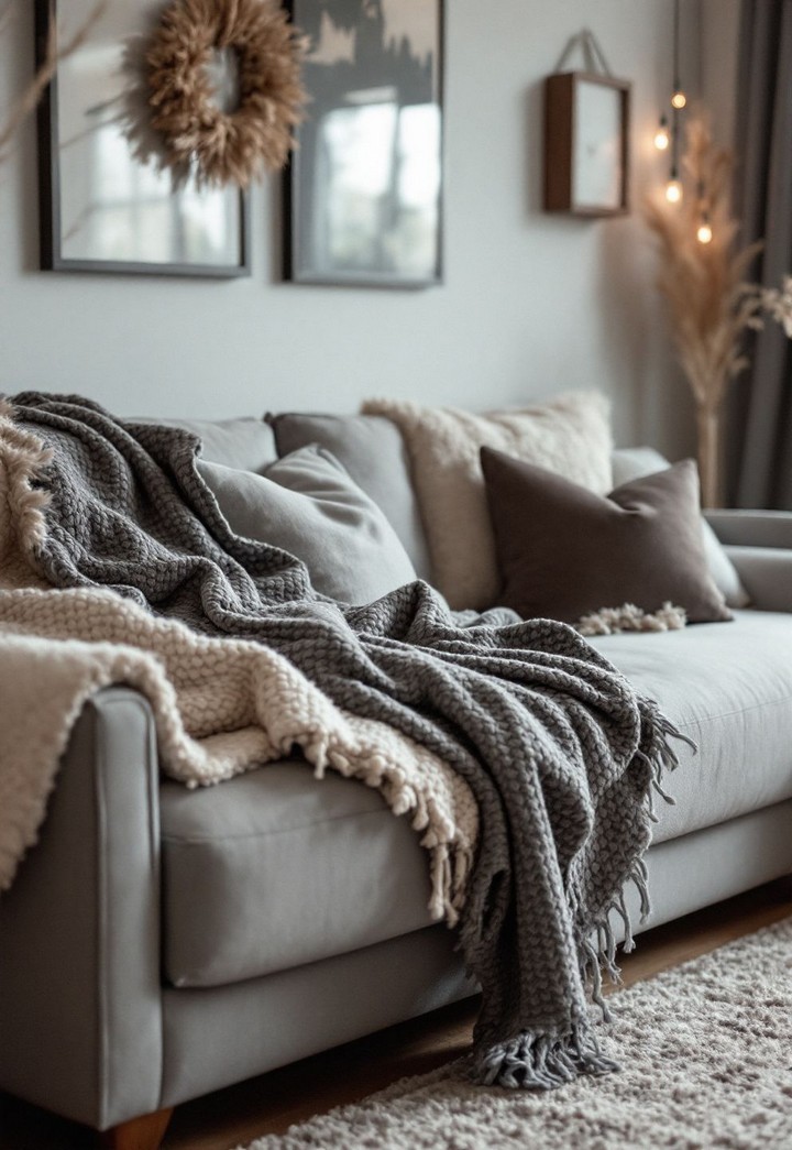 Layer multiple throw blankets in varying shades and textures of grey across seating areas. This approach adds comfort while creating visual interest through texture variation.