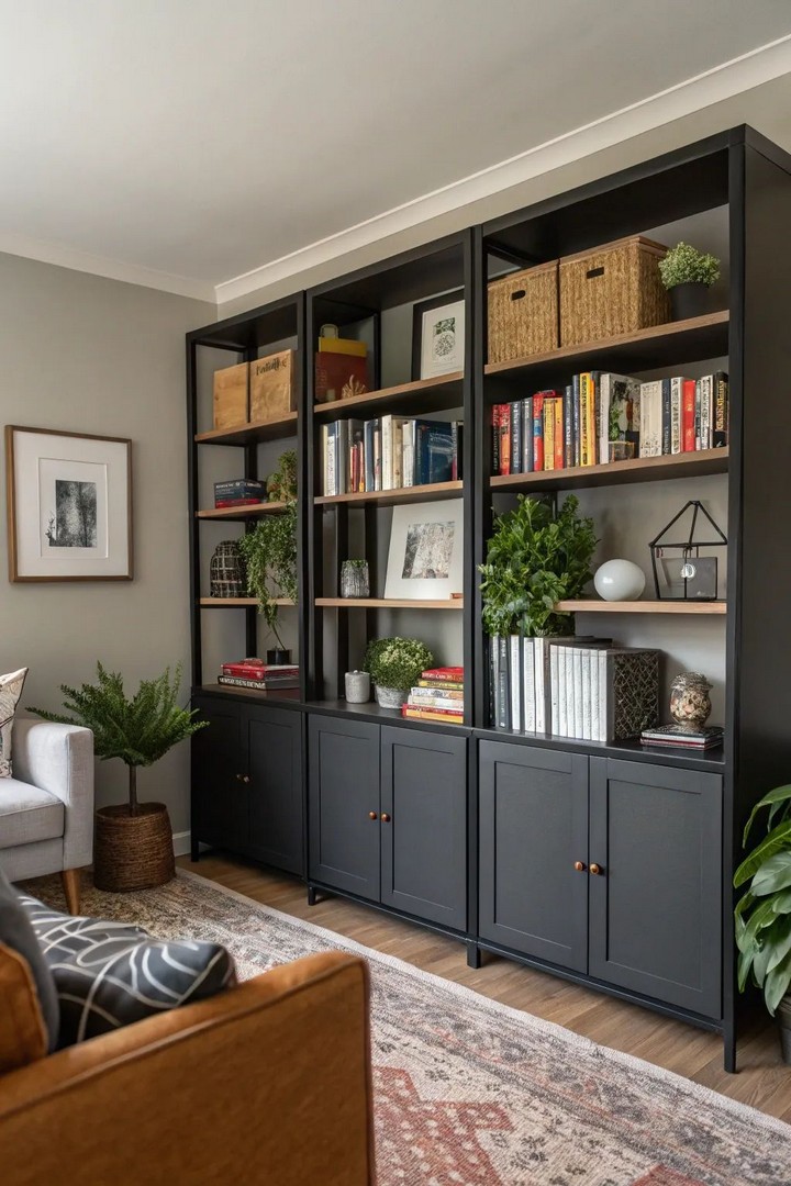 Paint built-in or standalone bookshelves in grey and style them with books, plants, and decorative objects in complementary colors for a curated, lived-in feel.