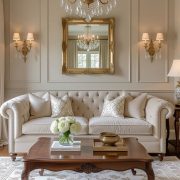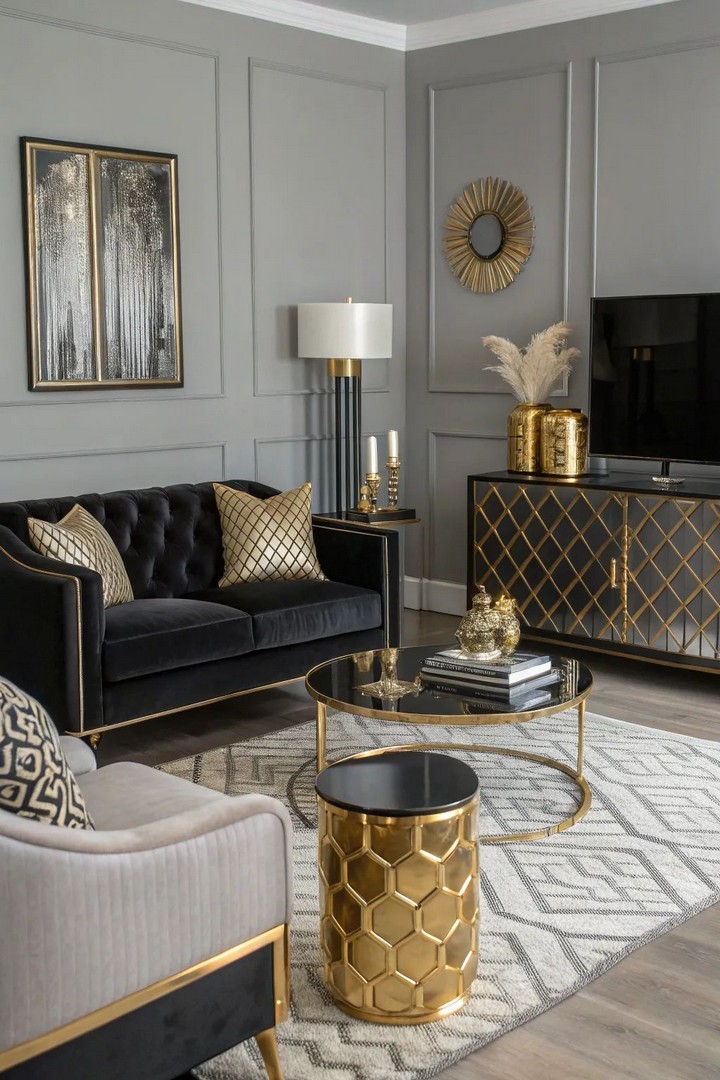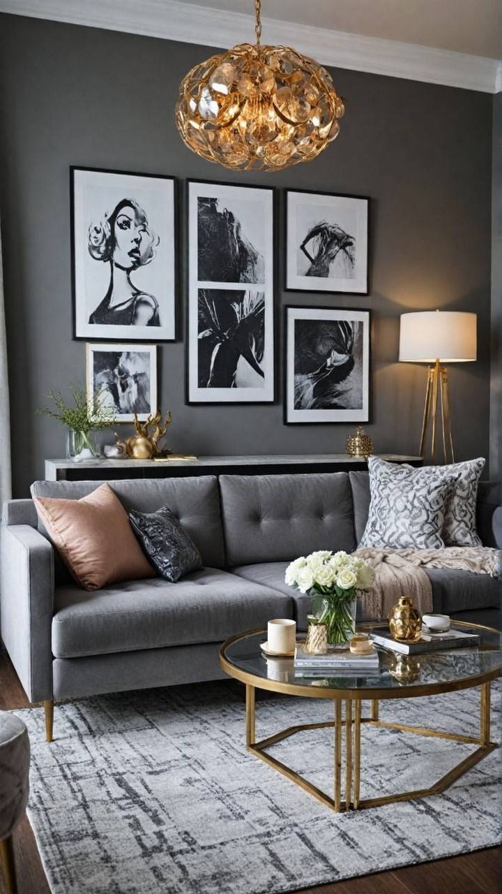 Incorporate brushed nickel, aged brass, and matte black metal finishes throughout your grey living room. These metallic elements add warmth and sophistication while complementing grey’s neutral nature.