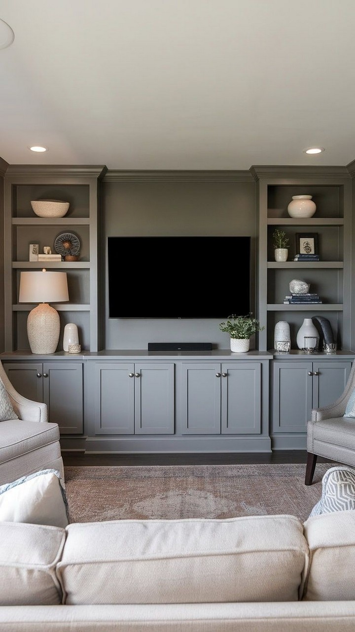 Create custom-looking storage with a grey painted built-in entertainment center. This approach provides functionality while maintaining the room’s cohesive color scheme.