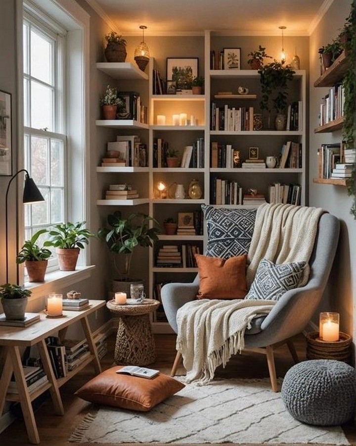 Designate a corner for a grey upholstered reading chair paired with a soft ottoman and good lighting. Add a small side table and personal touches like books and plants.