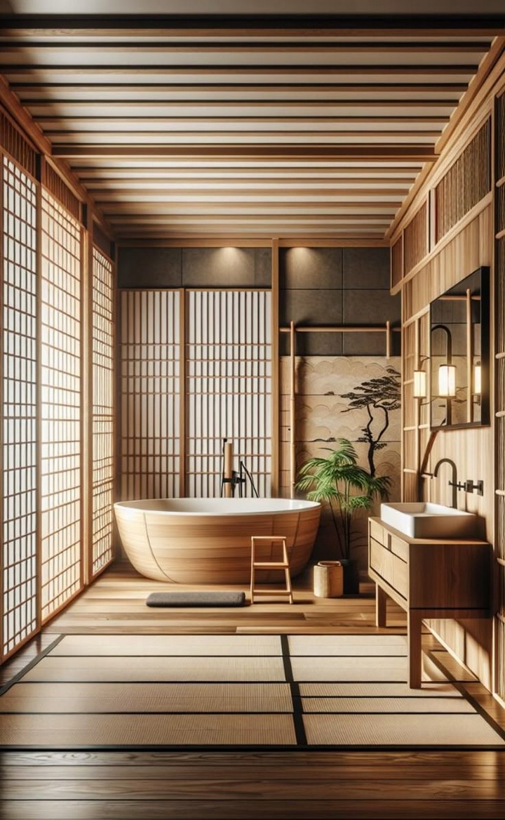 These elements bring visual warmth and textural subtlety to spaces that might otherwise feel cold or clinical, softening the hard surfaces necessarily predominant in wet environments while connecting to Japanese material traditions.
