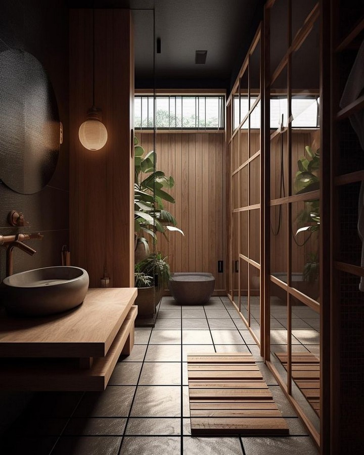 Rather than isolating bathing fixtures behind shower curtains or glass enclosures, traditional Japanese bathrooms embrace the “wet room” concept, where the entire space is designed to get wet. This approach, known as mizuya, creates a seamless, open feeling while eliminating the need for separate waterproofing zones.