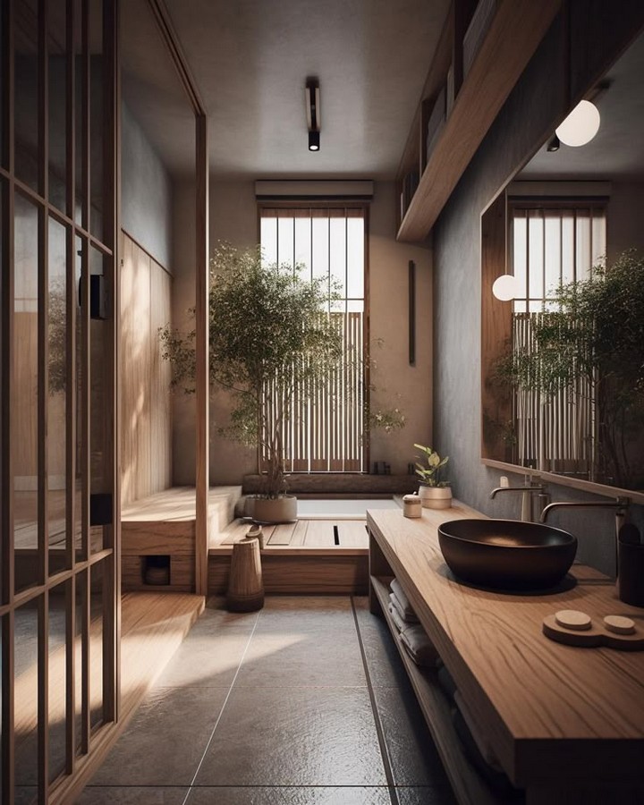 In traditional Japanese homes, the bathroom is conceptually divided into separate spaces the changing area (datsuijo), the washing area (araiba), and the bathing room (furo) containing the soaking tub. This differentiation creates a meaningful progression from the everyday world to the contemplative space of the bath.