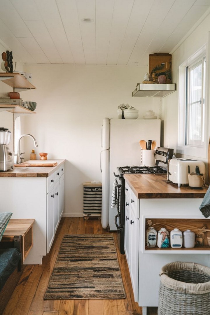Corner spaces offer valuable real estate in tiny kitchens. An L-shaped layout makes efficient use of corners while creating a natural workflow. This configuration works particularly well in tiny houses with the kitchen positioned at one end of the structure.