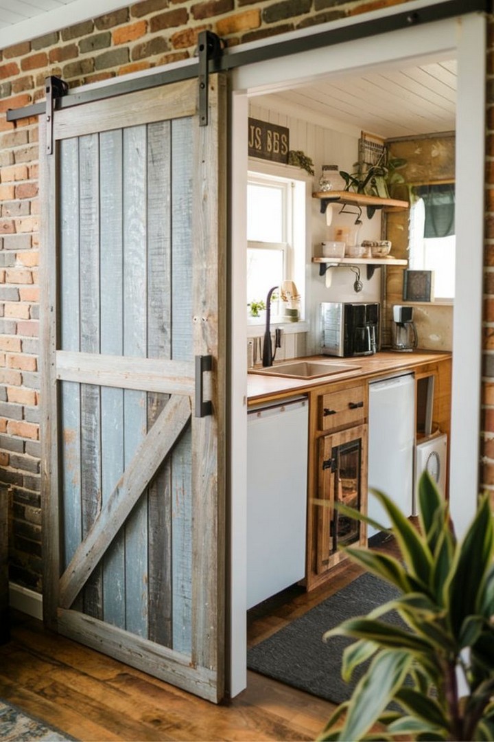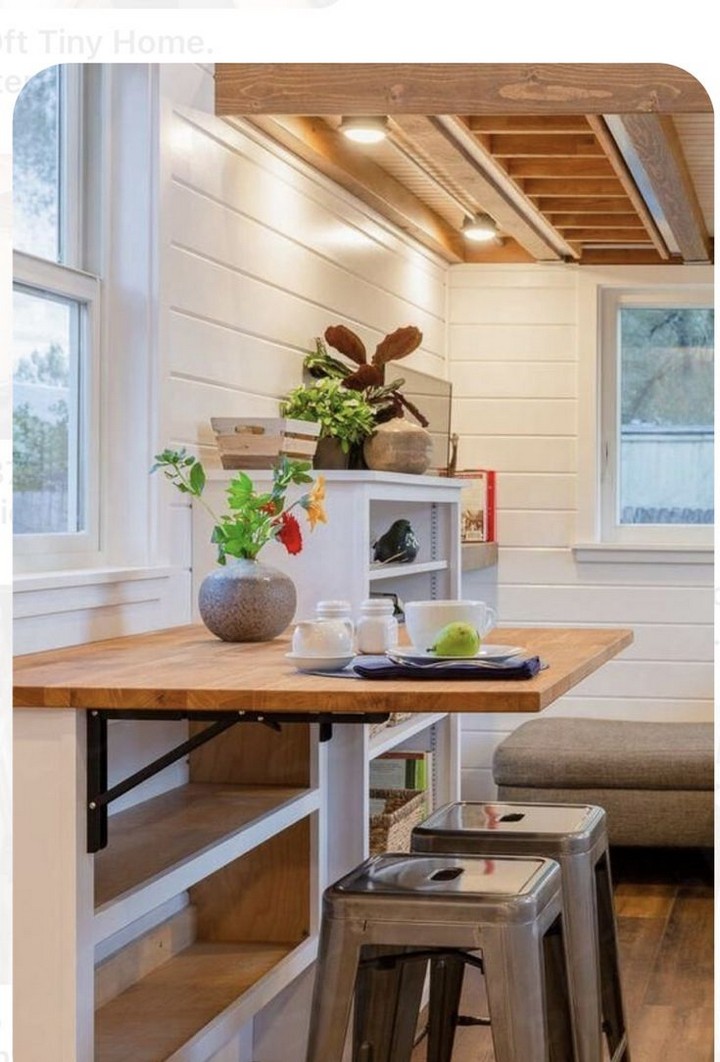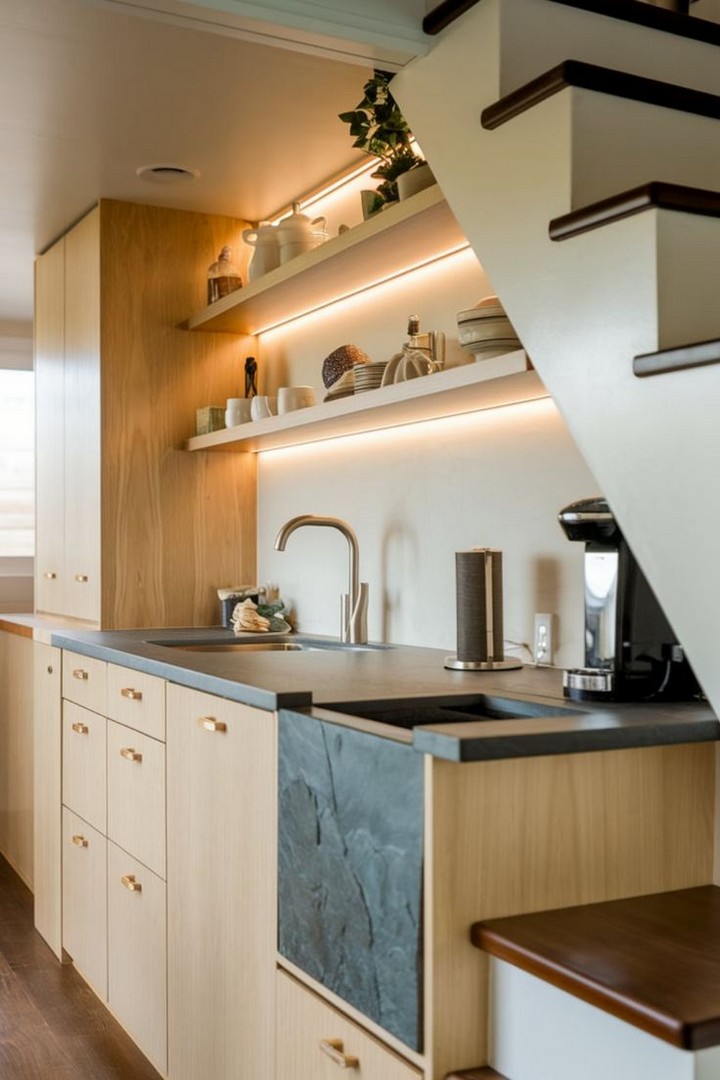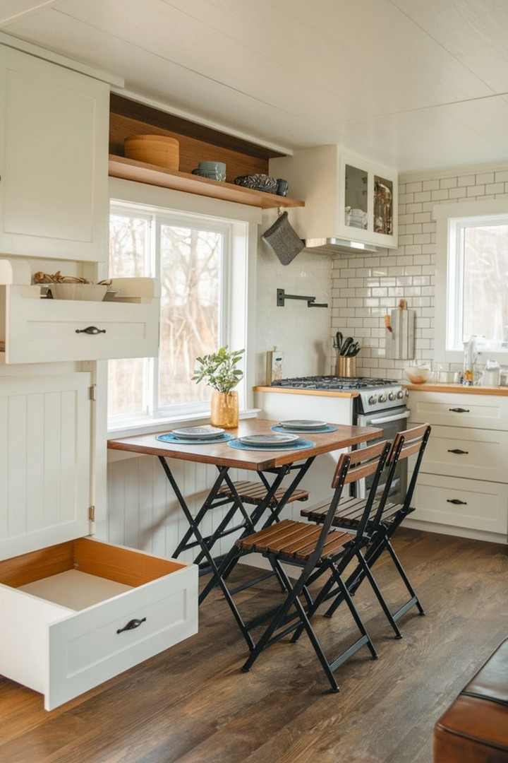 In tiny houses, kitchen storage often extends beyond traditional kitchen boundaries. Consider dining benches with hidden storage compartments for infrequently used items like special occasion serving pieces or seasonal bakeware.