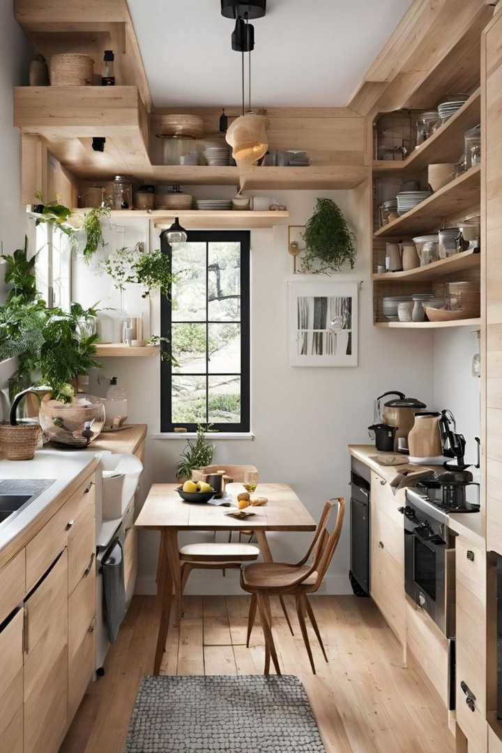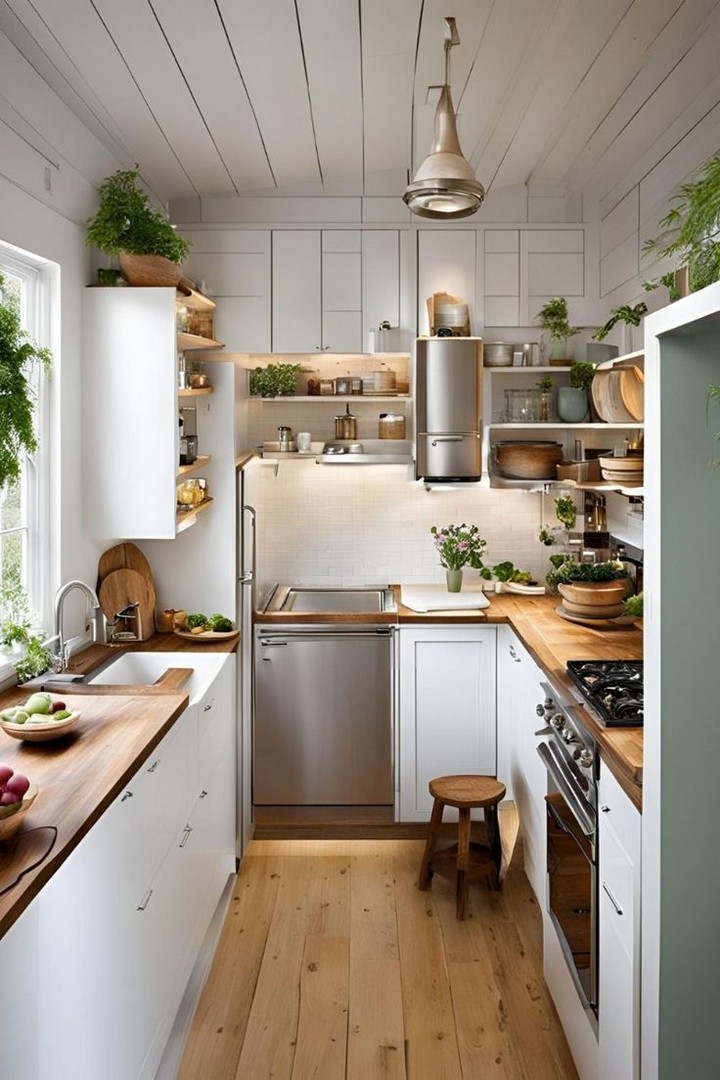 While closed storage efficiently utilizes space, strategic open shelving creates visual breathing room. Display visually appealing items like colorful dishes, glass containers of dry goods, or fresh herbs in attractive planters.