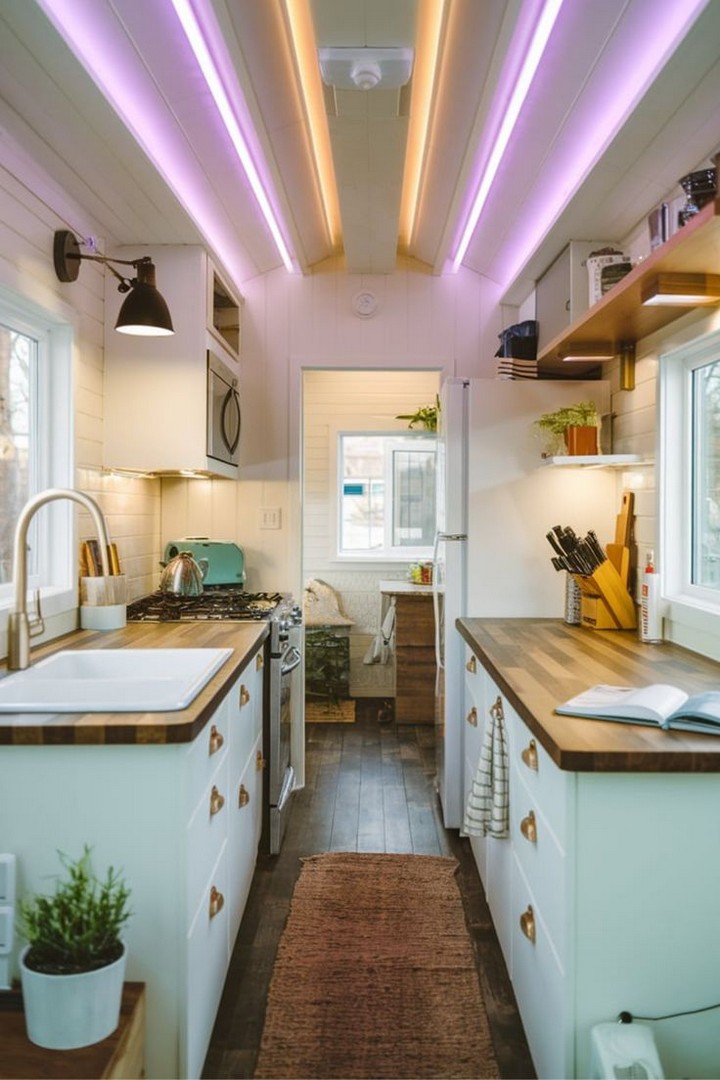 The galley layout featuring parallel countertops with a walkway between remains the gold standard for tiny house kitchens. This configuration maximizes counter space while keeping everything within easy reach. In the most successful tiny house galley kitchens, one side often incorporates major appliances while the opposite wall features prep space and storage.