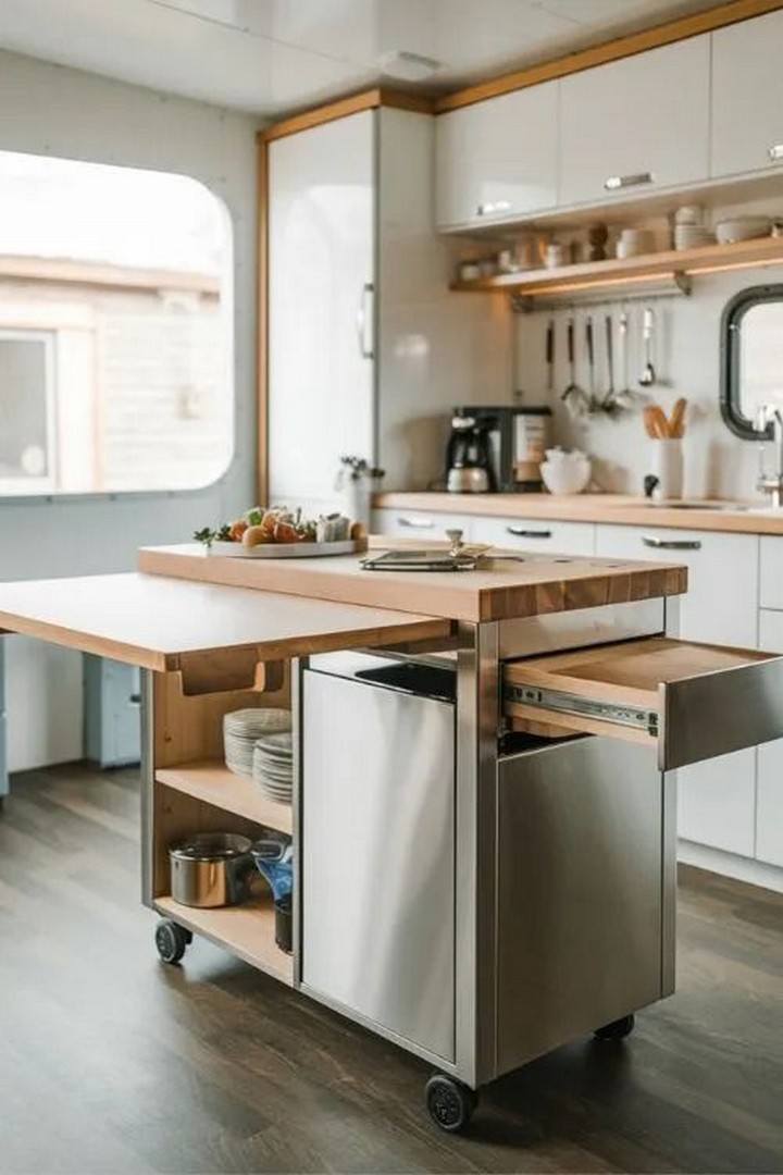 Portable kitchen islands offer game-changing flexibility in tiny house design. These movable workstations provide additional counter space when needed and can be repositioned or completely tucked away when not in use.