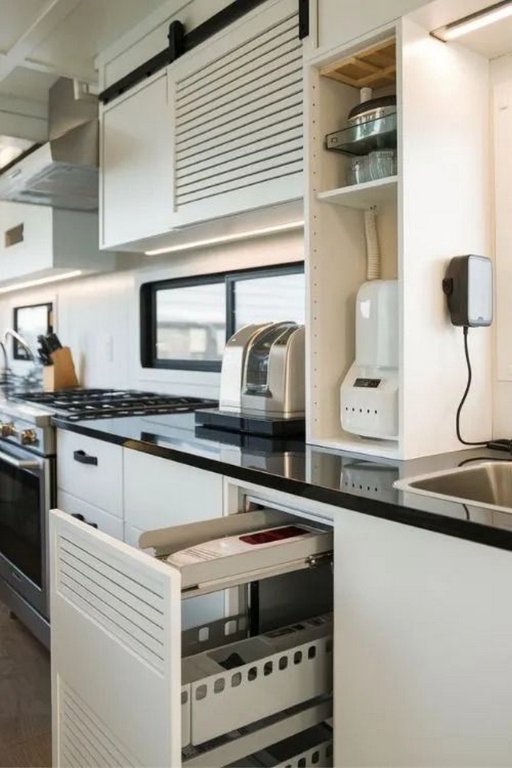 The most organized tiny house kitchens feature complete container systems where everything is visible, accessible, and logically arranged—often with similar items grouped together and stored near where they’ll be used. This thoughtful organization minimizes time spent searching for ingredients during meal preparation.