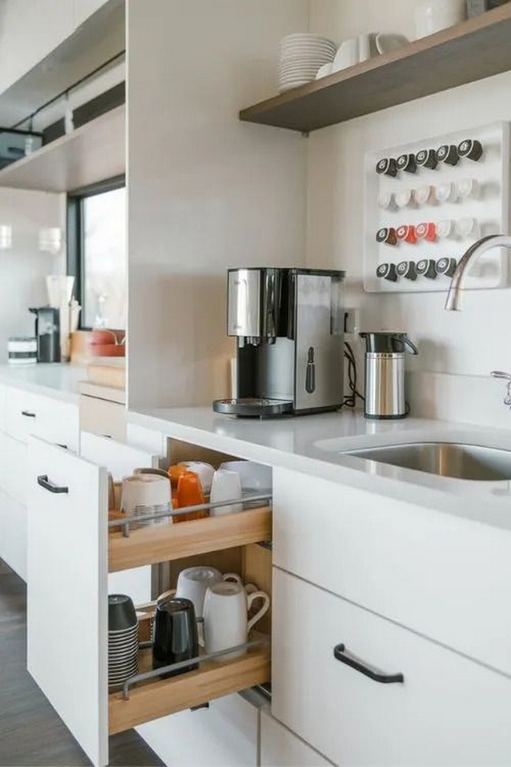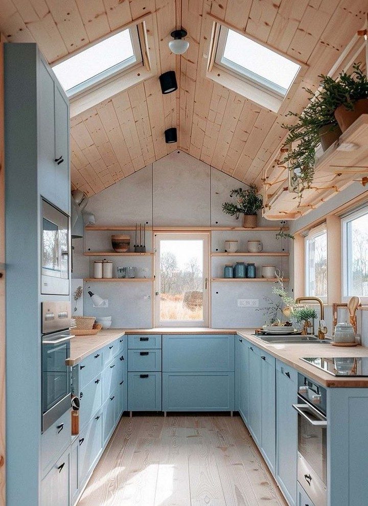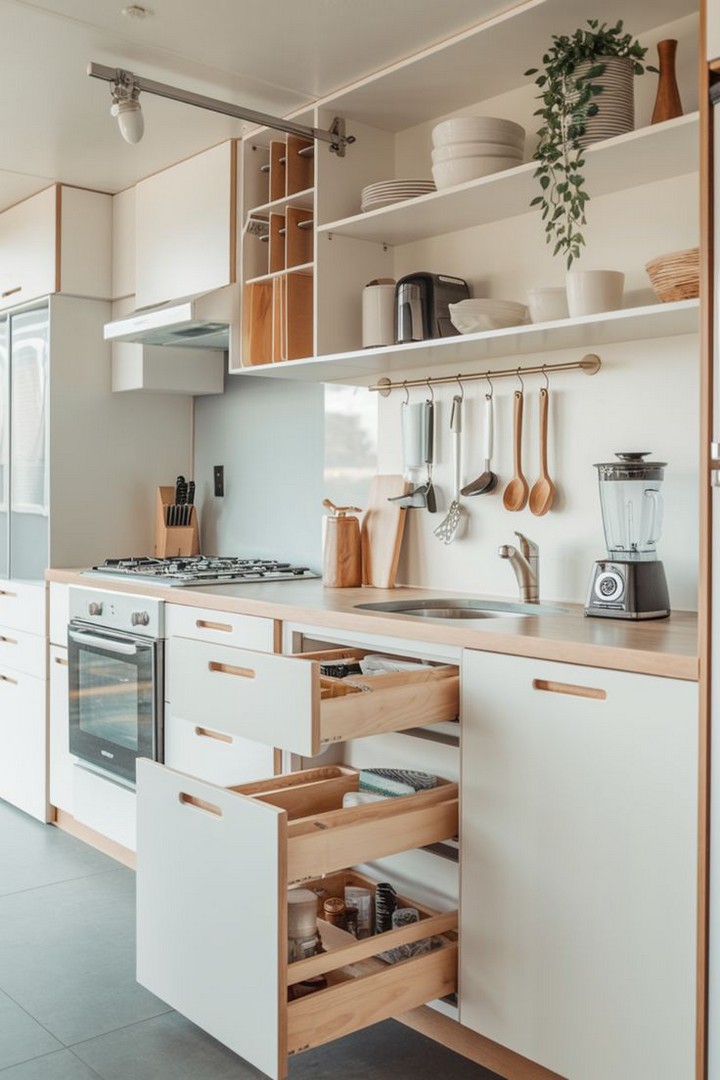 When floor space is limited, vertical storage becomes essential. Tiny house kitchens benefit from cabinets that extend to the ceiling, utilizing every available inch. For accessibility, incorporate pull-down shelving systems in upper cabinets to bring items within easy reach.