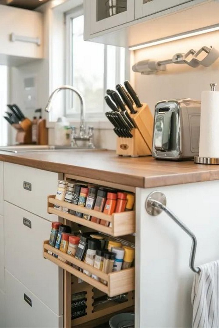 Door-mounted organizers utilize the interior cabinet door space for spice storage, cleaning supplies, or pot lids. Some tiny house builders incorporate custom inserts sized precisely for residents’ specific kitchen items, ensuring that every inch serves a defined purpose rather than creating dead space around irregularly shaped items.