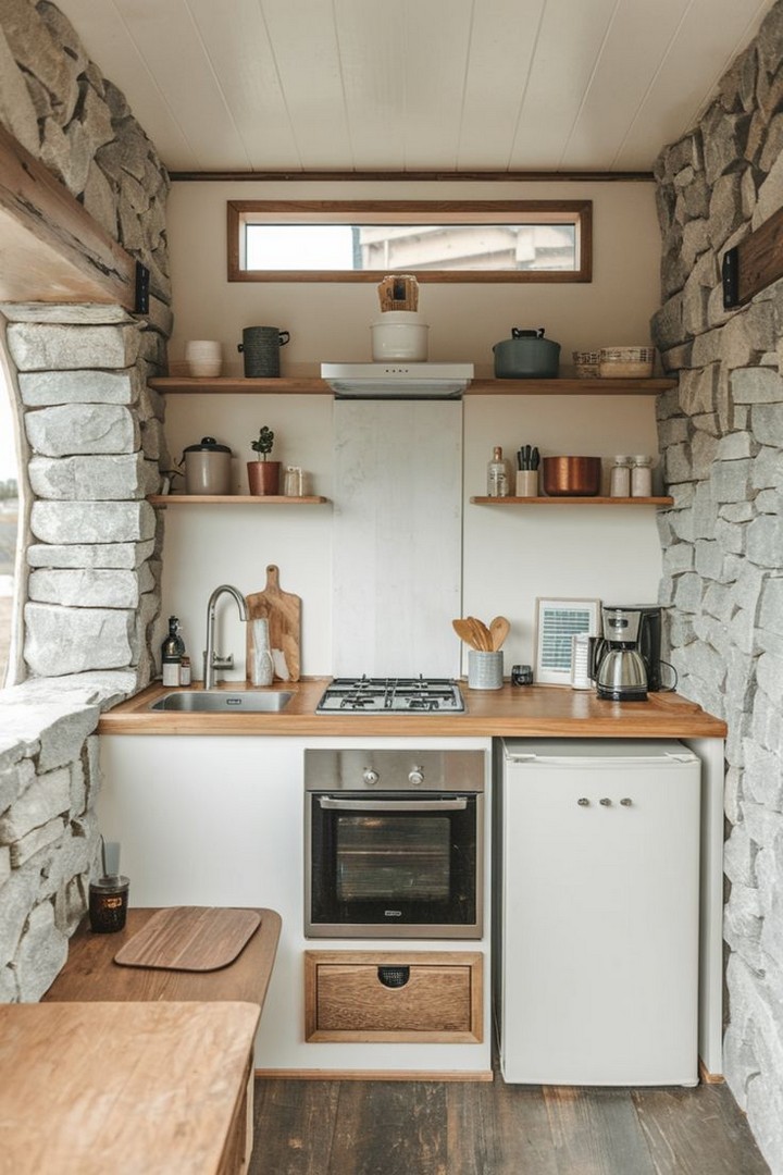 For the smallest tiny homes, a single-wall kitchen layout offers maximum space efficiency. This design places all components storage, appliances, sink, and prep areas—against one wall, leaving the opposite space open for living functions.