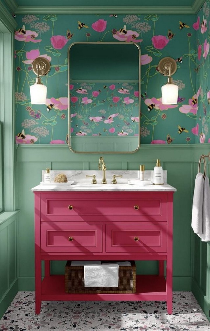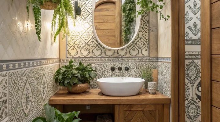 Rich, detailed encaustic cement tiles in jewel tones create instant luxury and cultural sophistication, perfect for powder room accent walls.