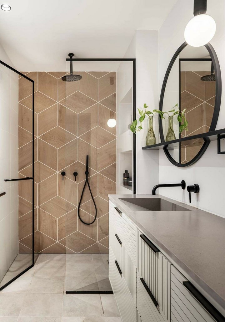 Combine wood-look and stone-look porcelain tiles to achieve multi-material luxury without natural material maintenance concerns.