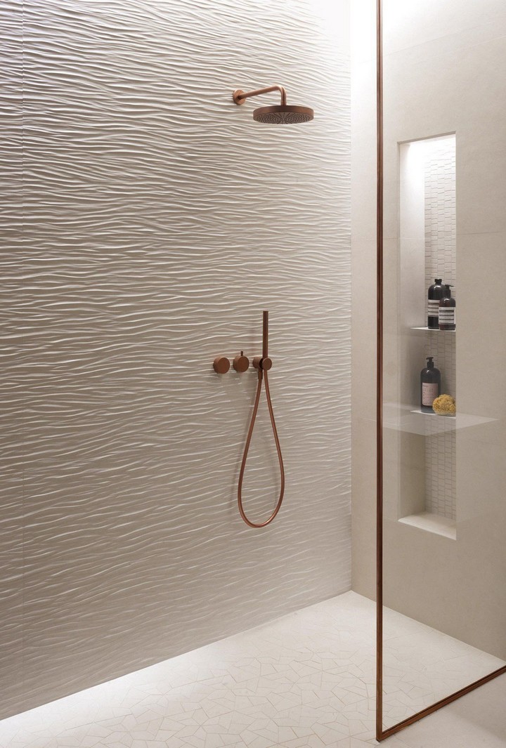 Sculptural tiles with raised surfaces cast shadows that add depth and movement to flat walls, creating visual intrigue in compact spaces.
