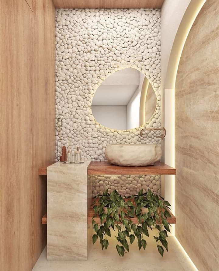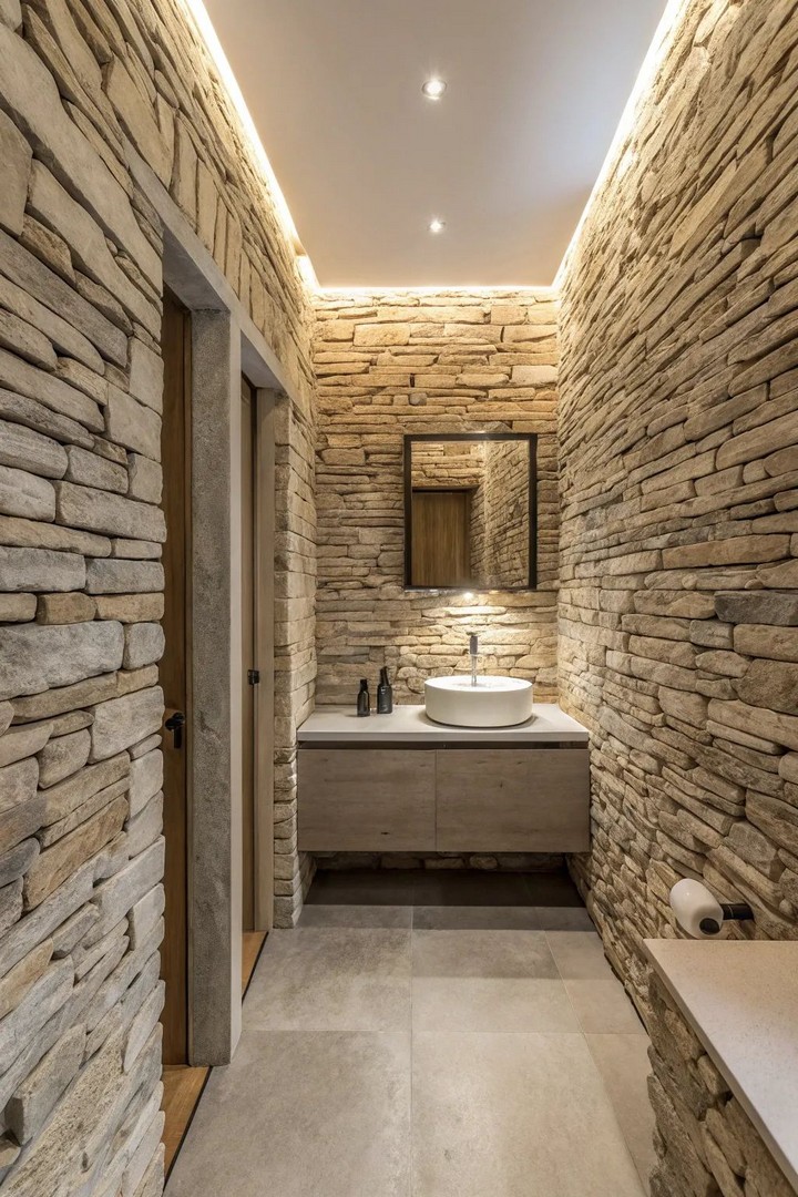 Stack natural stone tiles in alternating sizes to create organic texture reminiscent of high-end resort bathrooms.