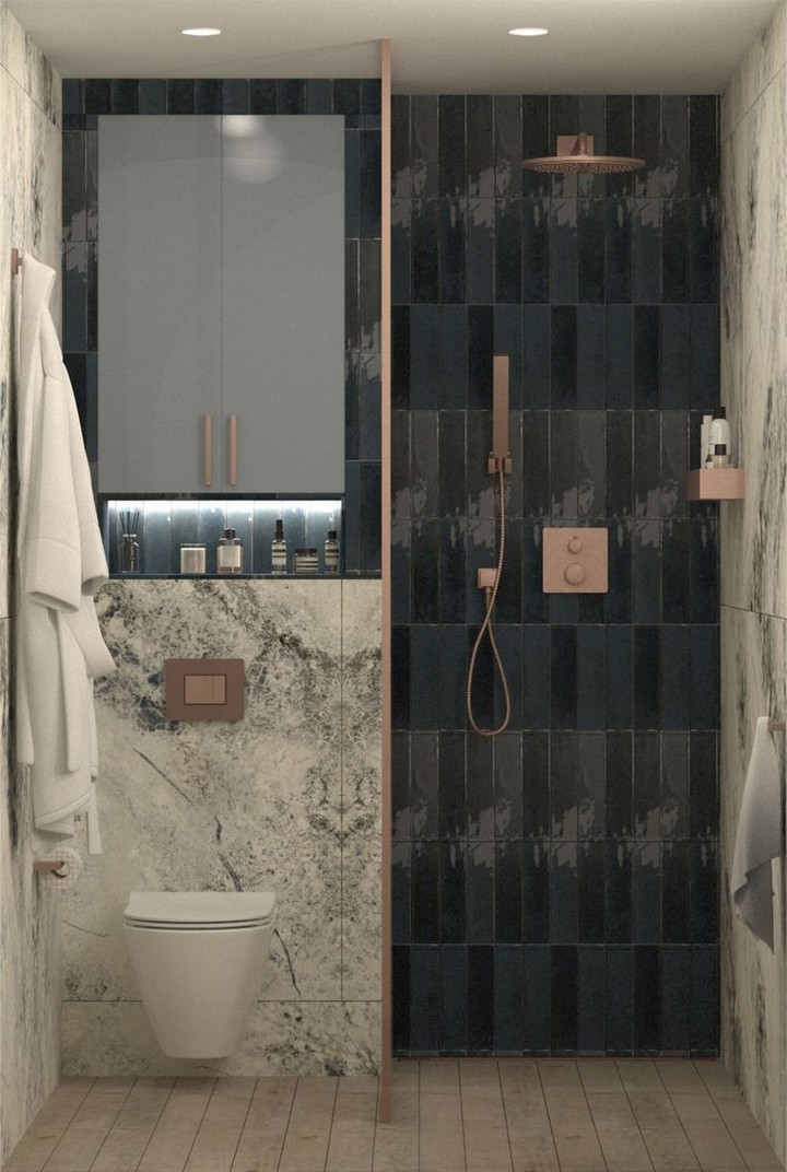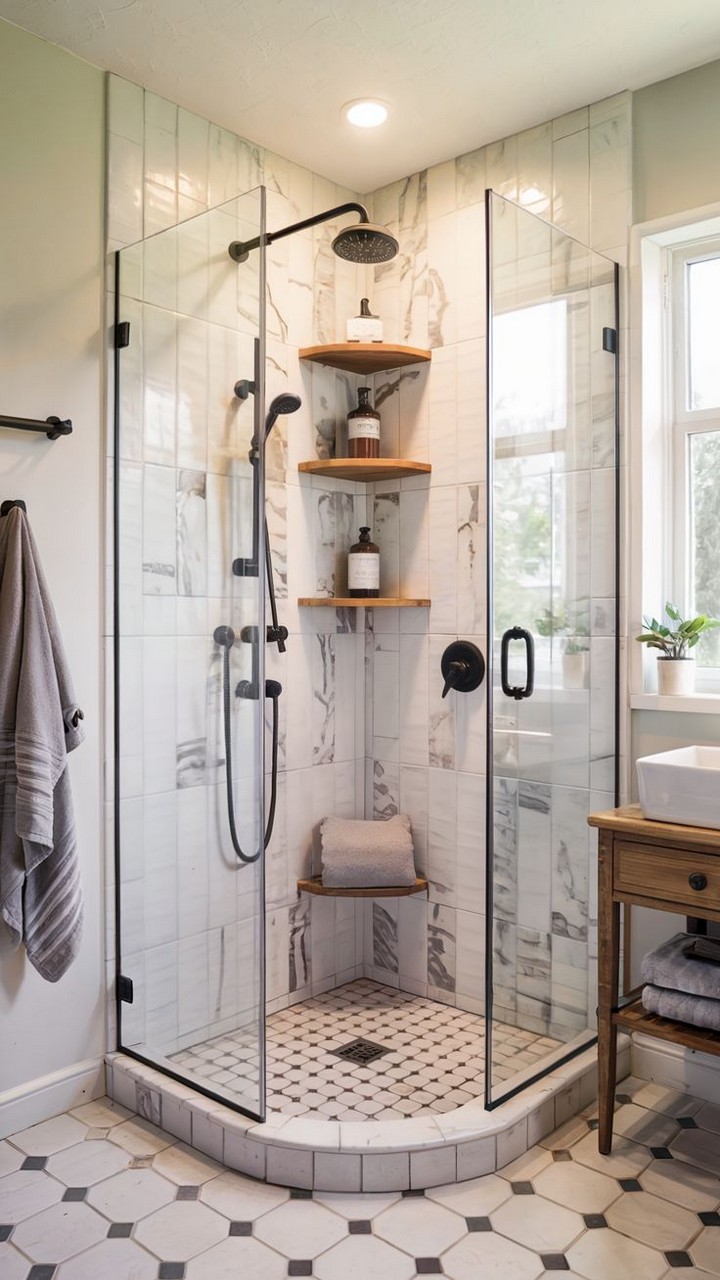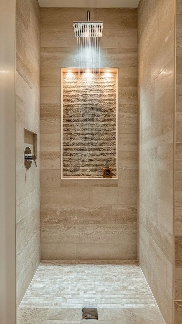 Use contrasting or accent tiles within shower niches to create built-in artwork that elevates functional storage to decorative status.