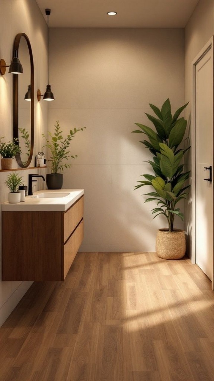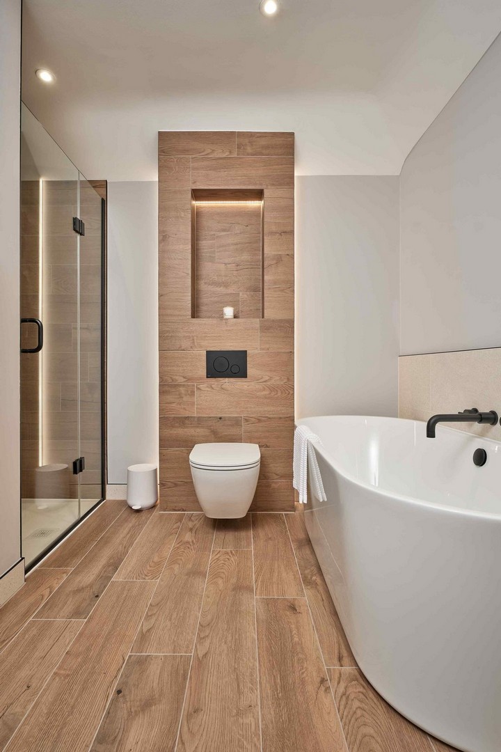 Wood-look porcelain planks installed horizontally can make narrow bathrooms feel wider while adding natural warmth to clinical spaces.