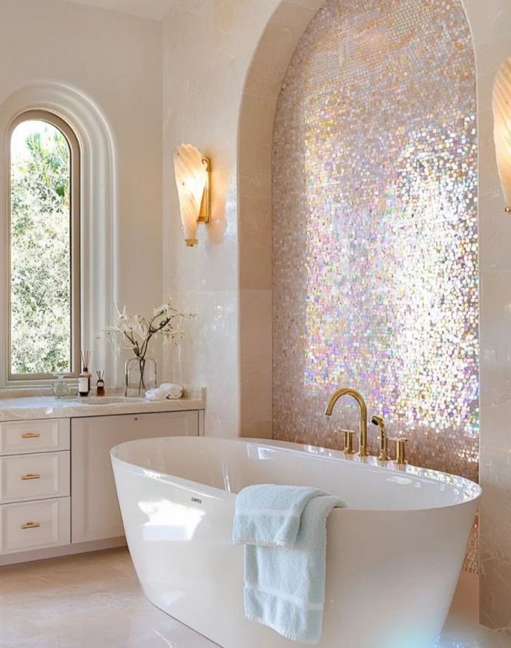 Glass mosaic tiles with iridescent properties shift color as light hits them from different angles, creating dynamic visual interest that makes small spaces feel alive and sophisticated.