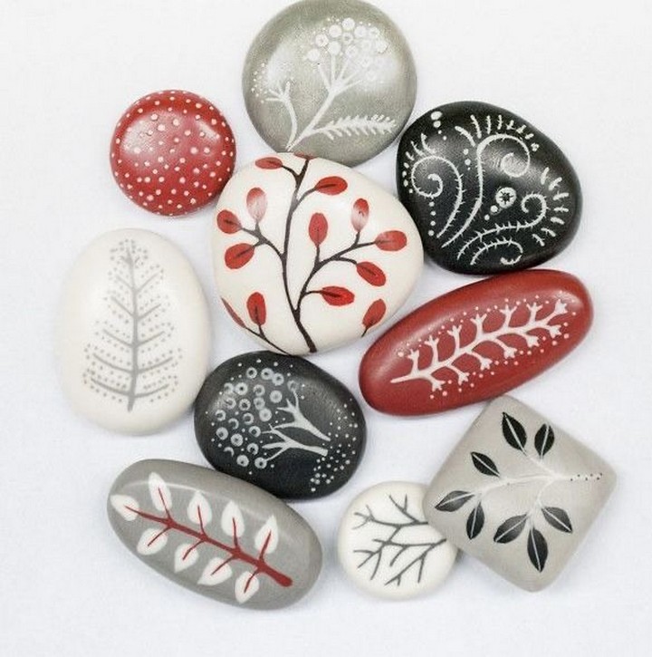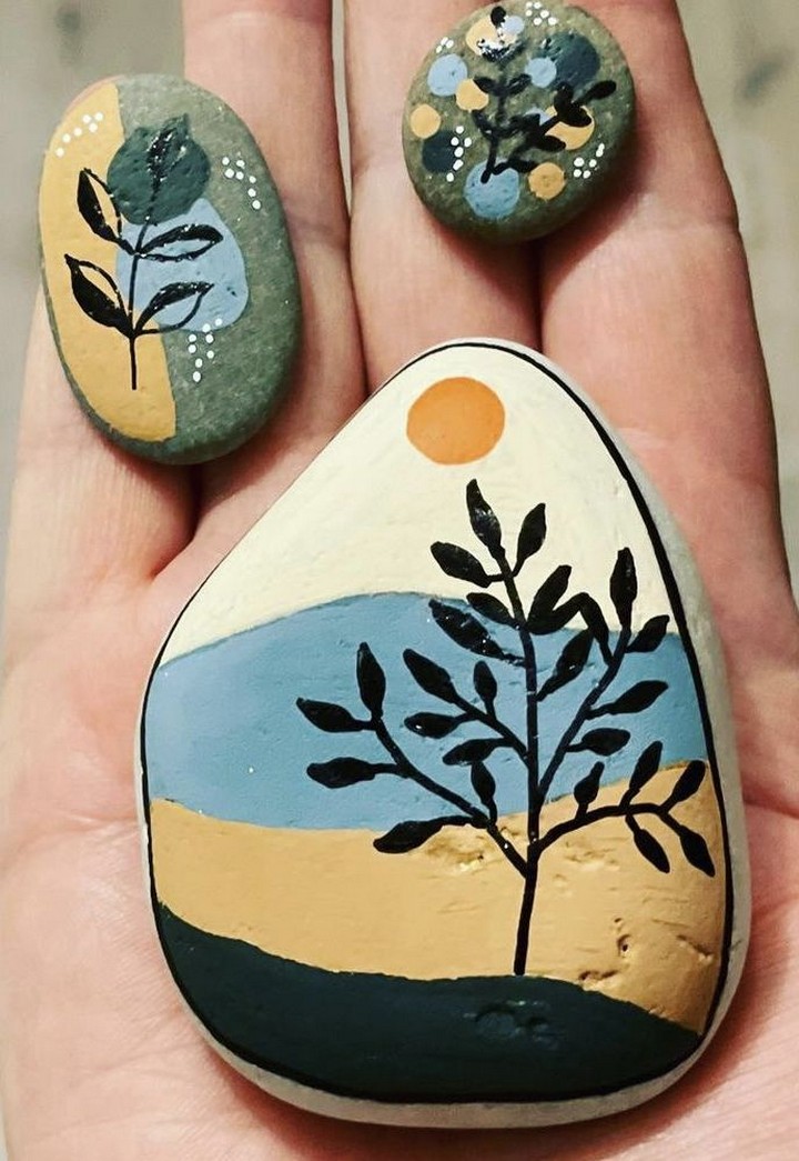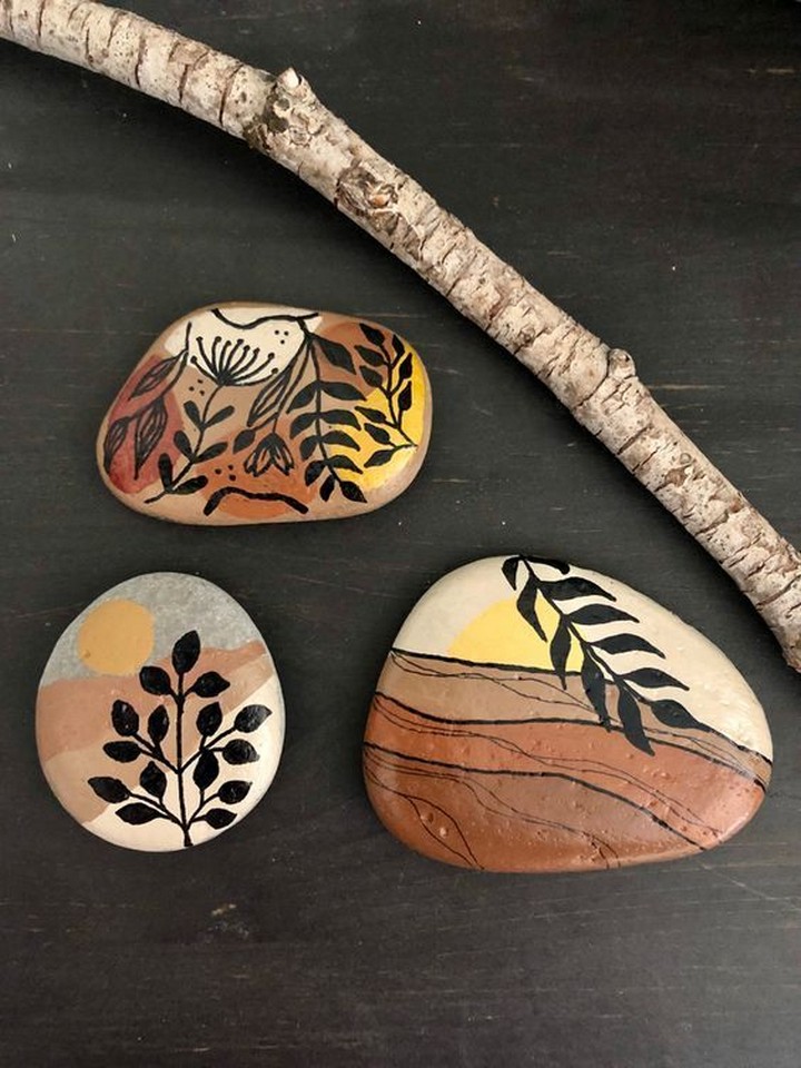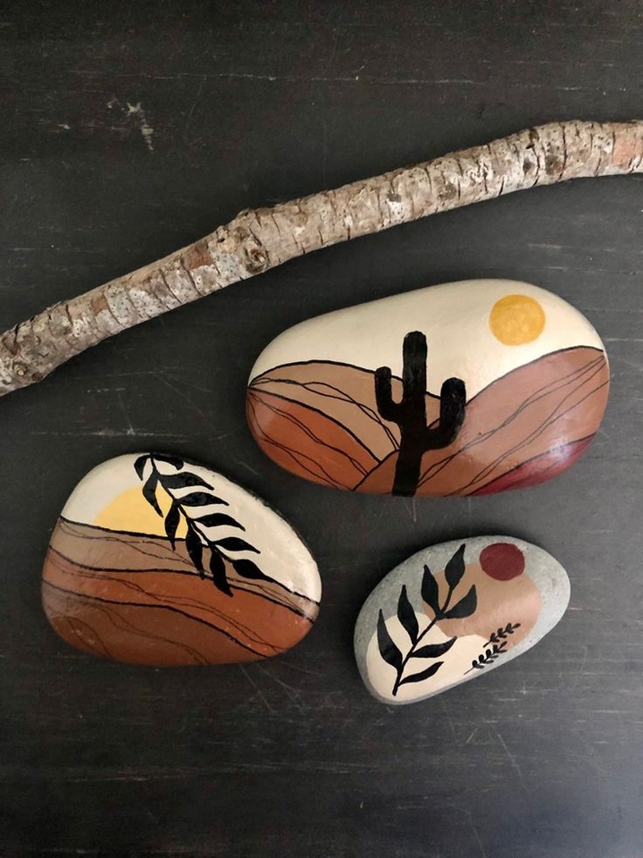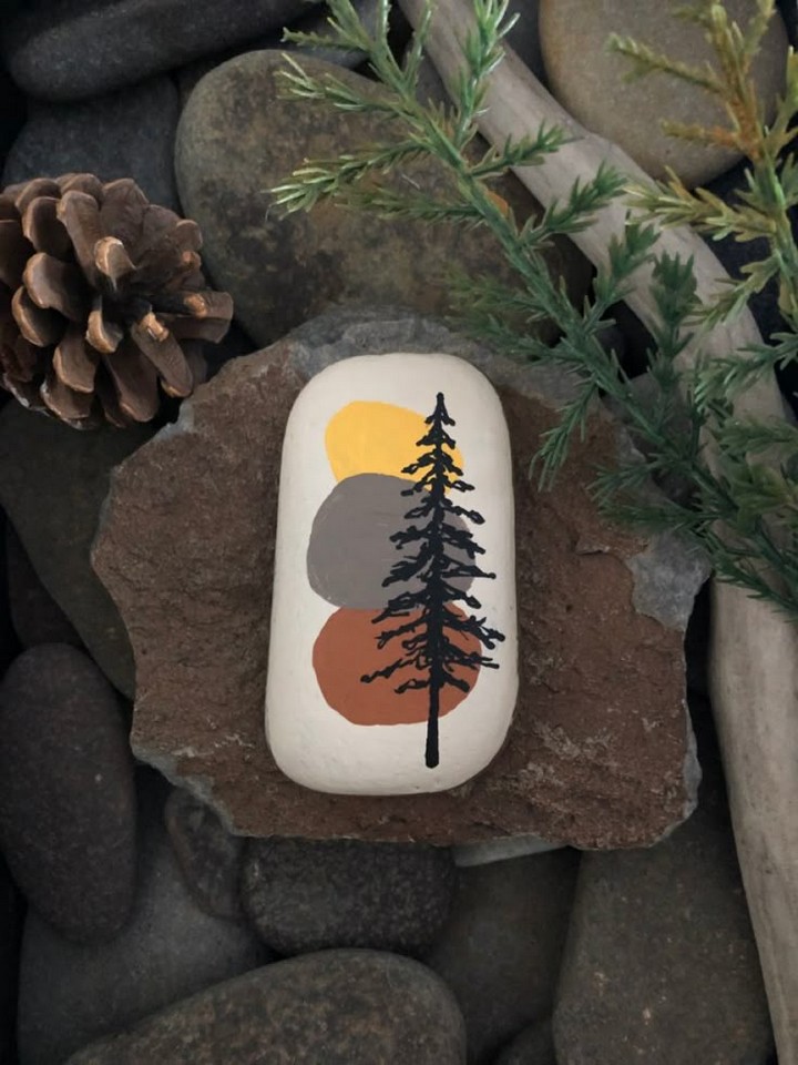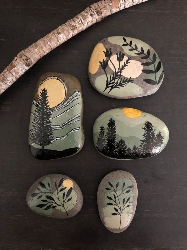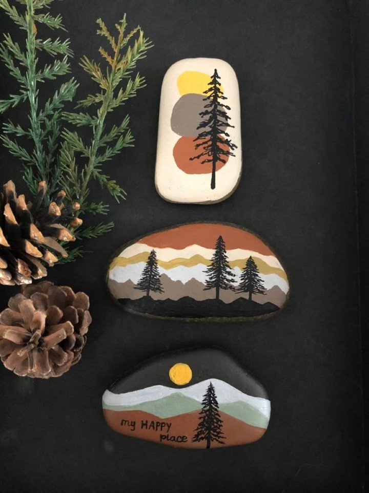 Create snowy landscapes with bare trees, snowflakes, or winter animals. Use white paint sparingly and let the stone’s natural color show through in places.